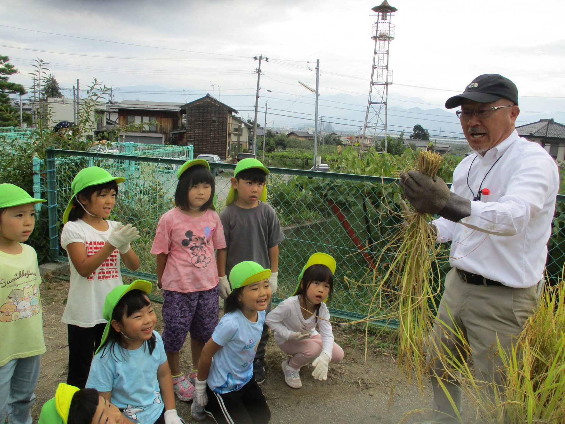 園長先生に稲刈りの仕方を教えていただき、手を添えてもらいながら一緒に行いました。刈ったときの「ざくっ!」という音に「いい音!」「すごいね!」と驚いた様子でした。