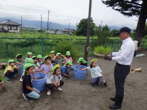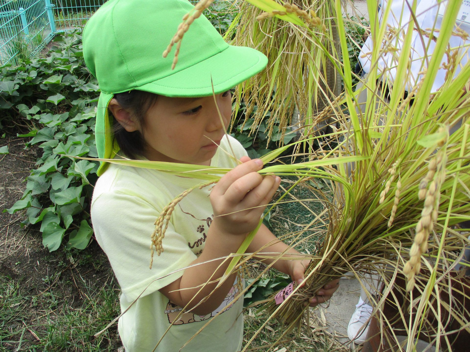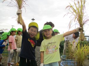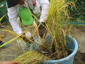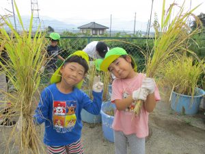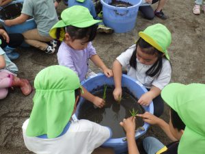 ・バケツを利用して6月に田植えをする。生長の様子を観察していく中で、土が乾いたら水を足したり、かぶとえびを見つけたり、草が生えたことに気づいたらみんなで草取りをしたりと、大事に育てていきながら9月に稲刈りの体験をする。