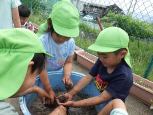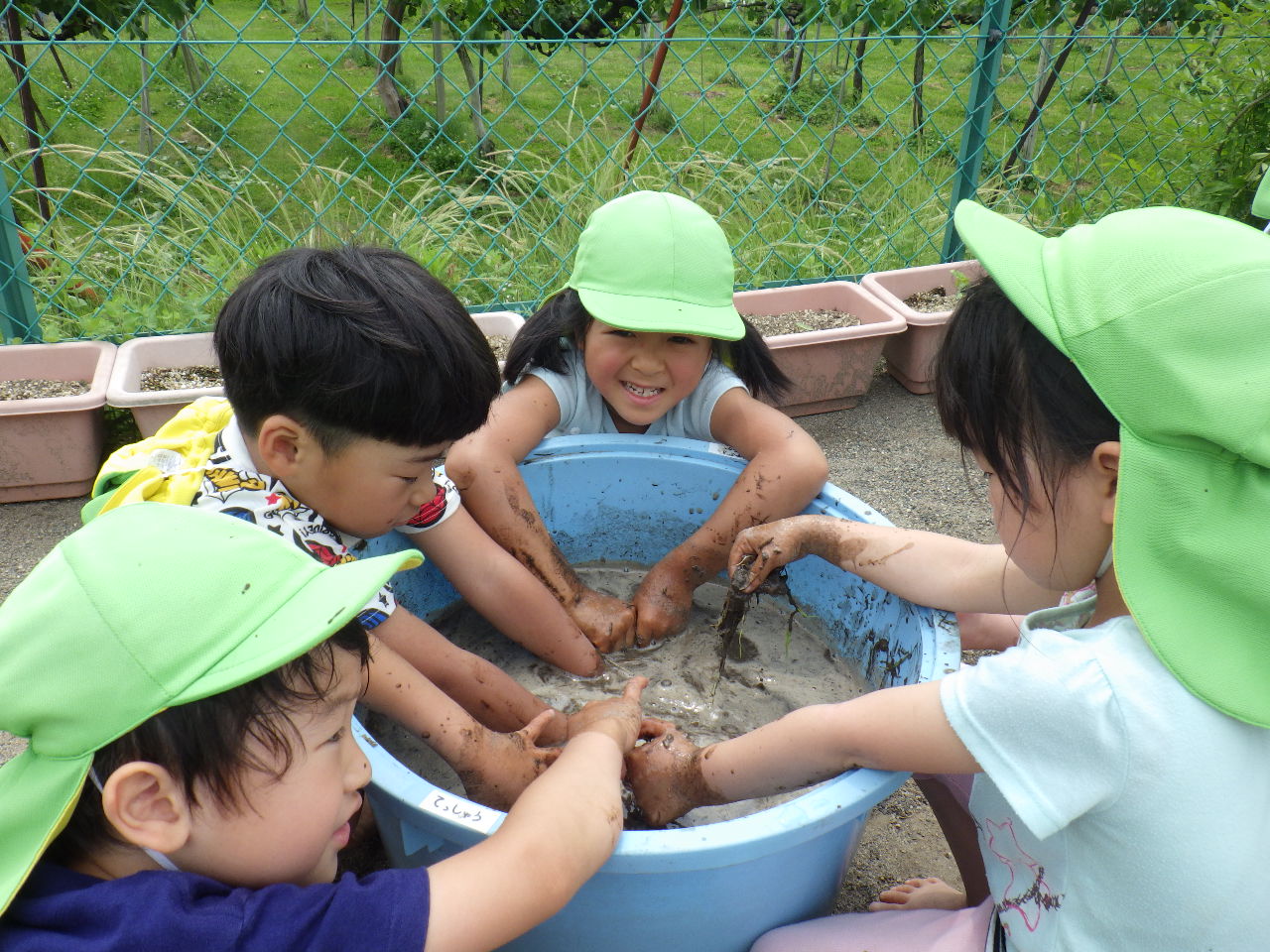 土の中にそーっと手を入れこねてみると、「つめたーい」「どろどろするー」「気持ちいいけど気持ち悪いー!」と感触を楽しみながら、ていねいに気持ちを込めてこねていました。