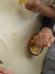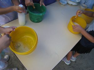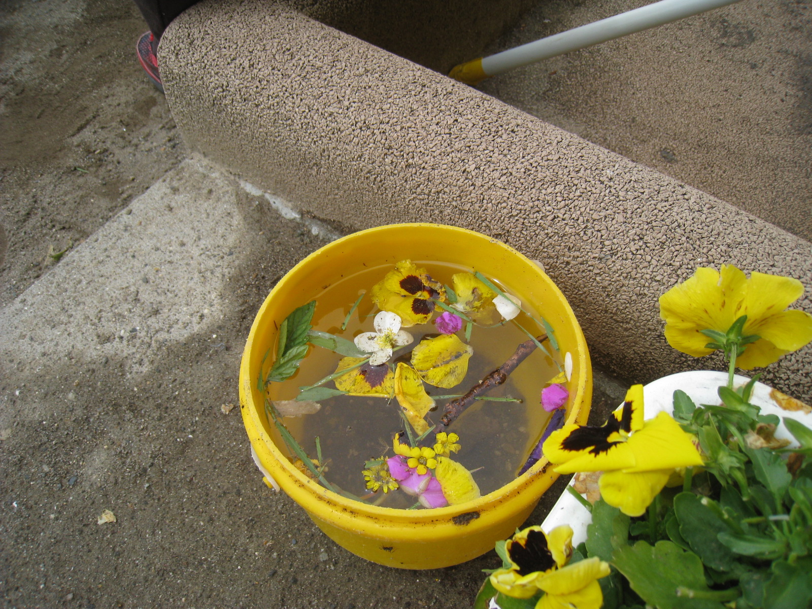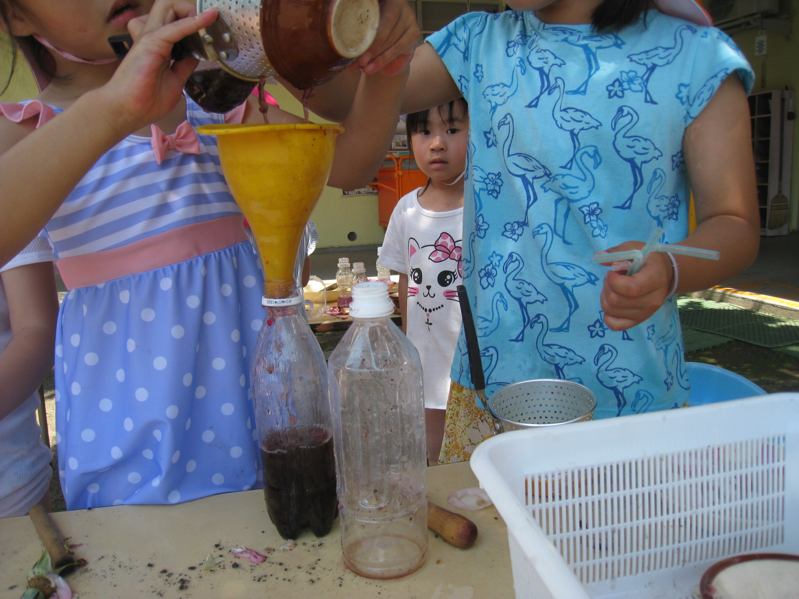 すり鉢で一生懸命花びらを潰して色水を作った花組の子どもたち。