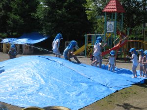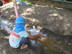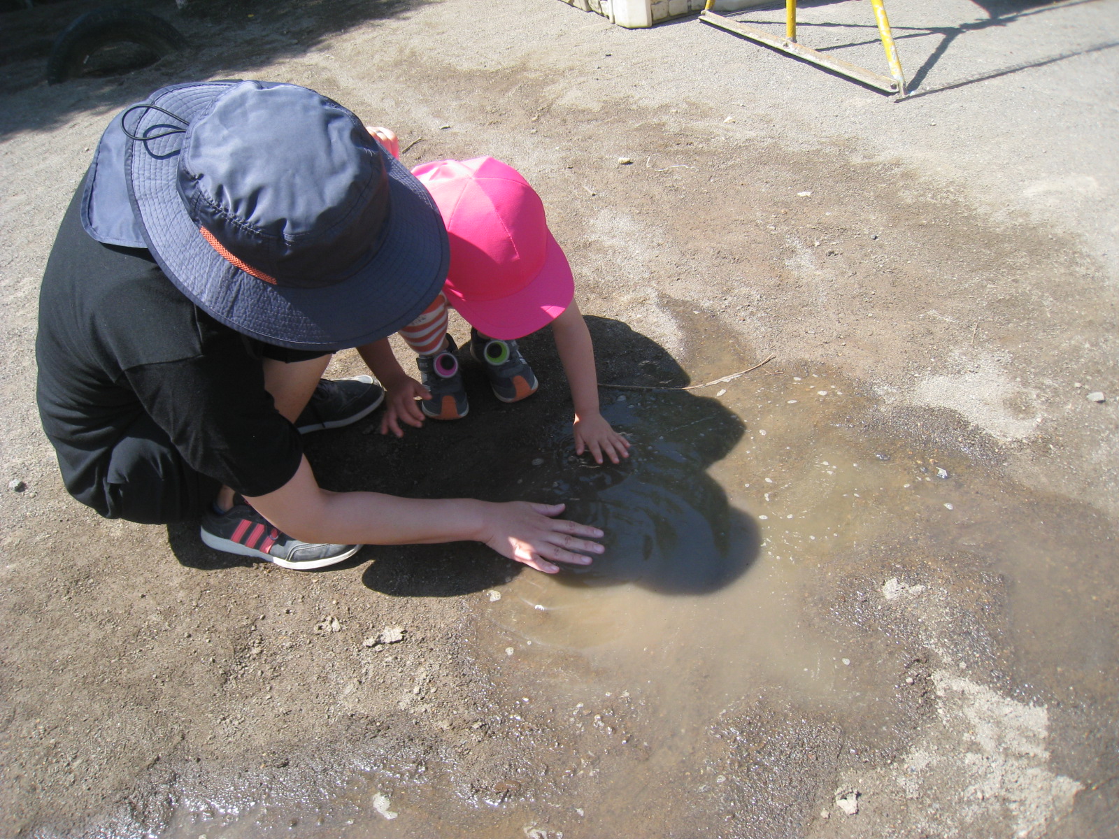 東っ子広場に水が流れ始め、園庭のいたるところに水たまりができています。