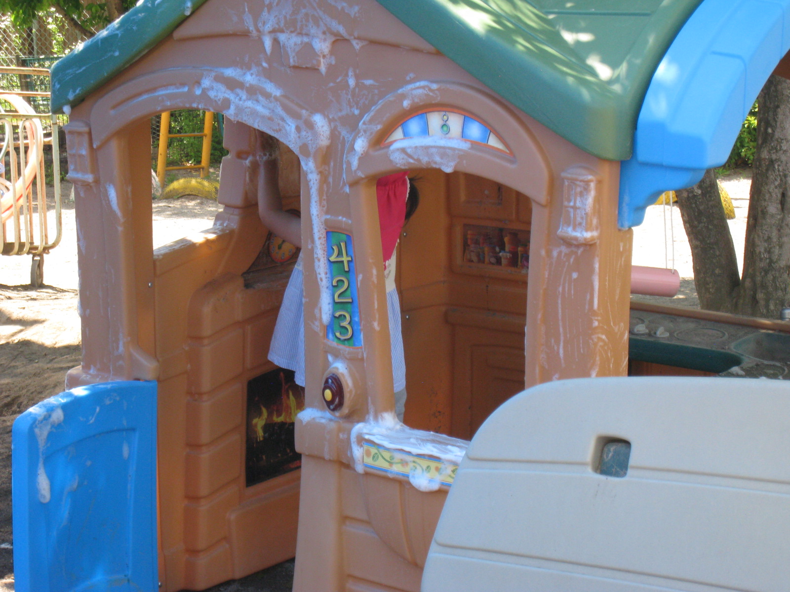 泡遊びを始めたお友だちがままごとハウスをきれいにお掃除してくれたんですって!