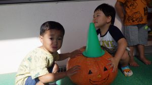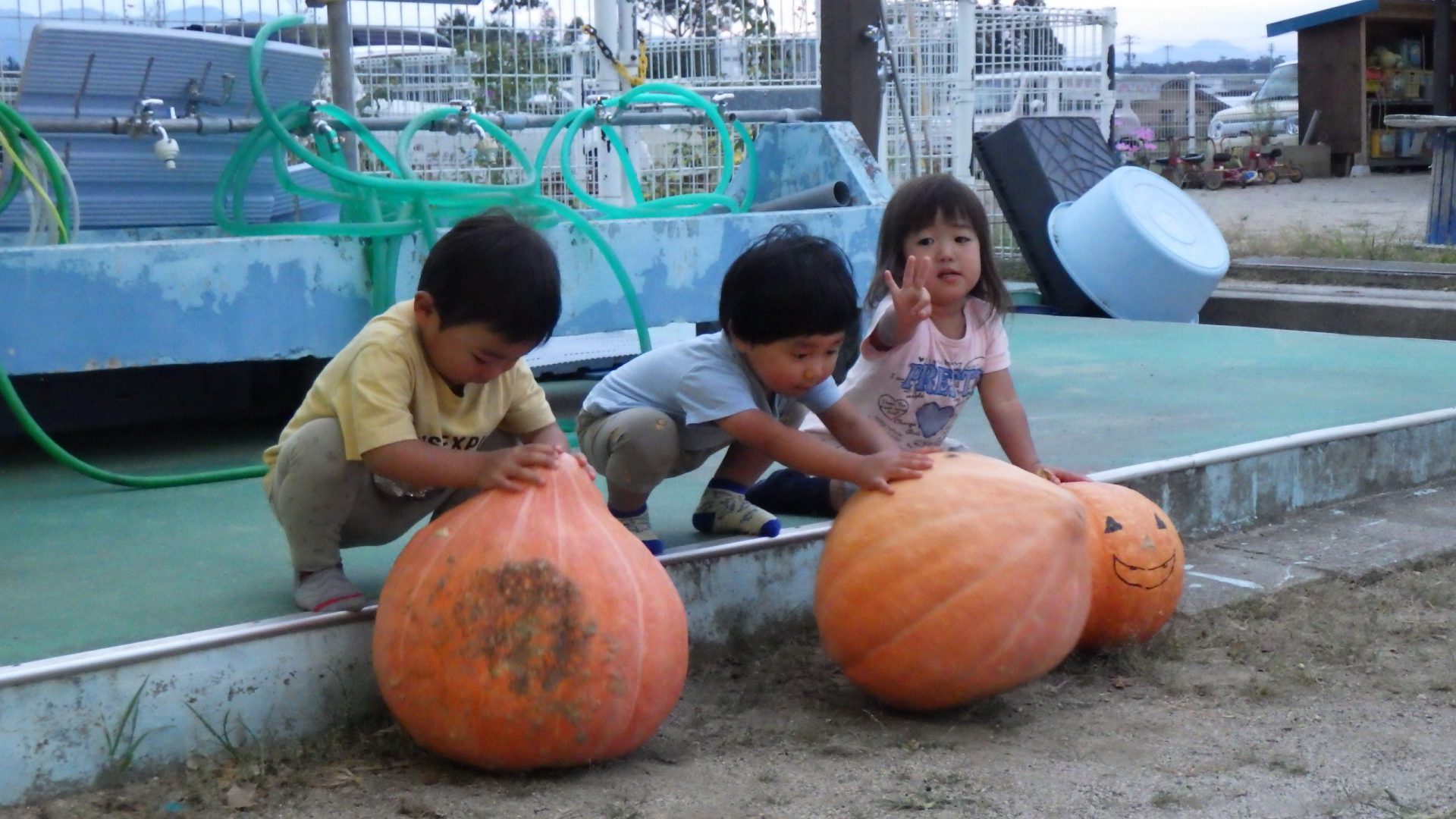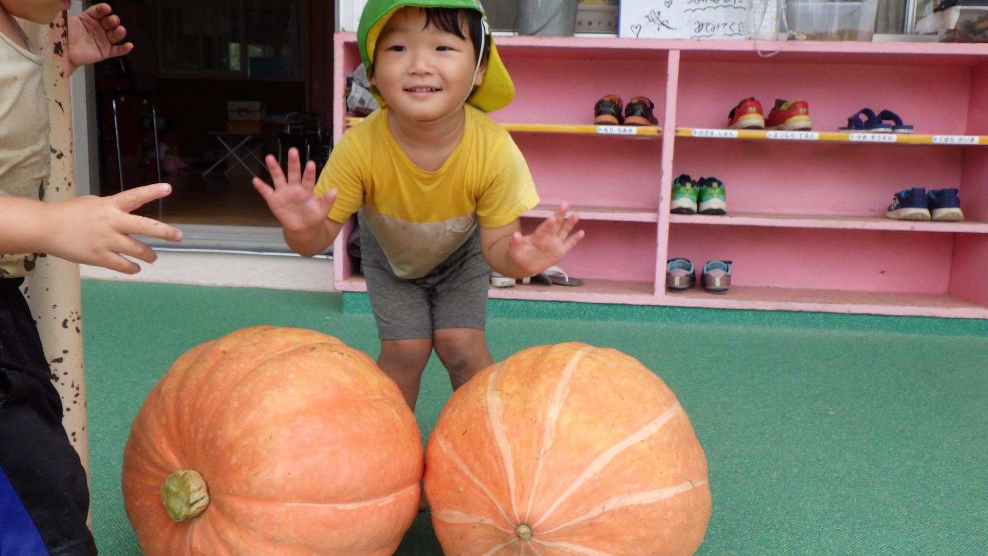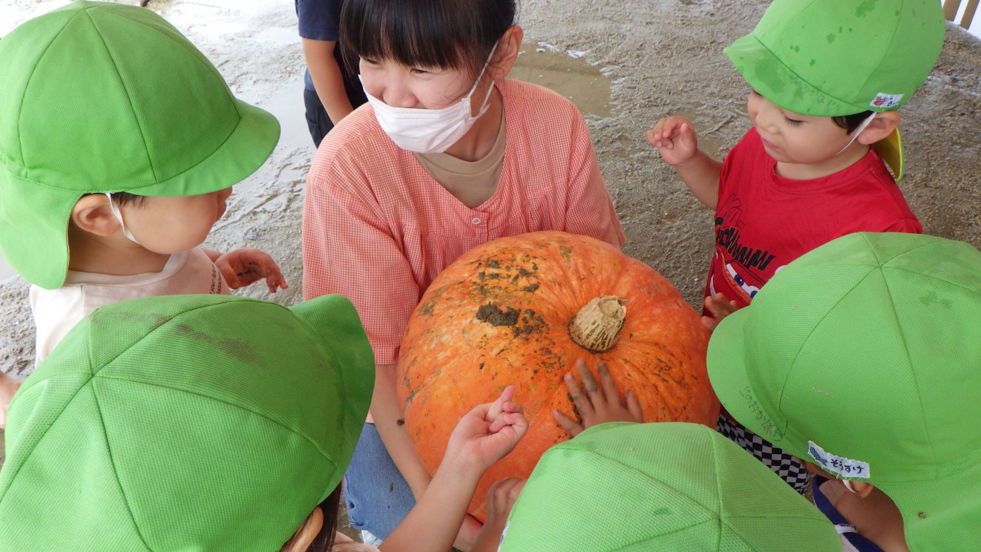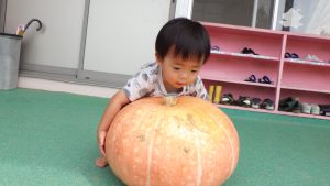 ・1歳児がこのかぼちゃを持って帰りたいと泣き出すかわいい姿も見られた。どこに行って「ハロウィン」の装飾がなされ、子どもたちも目にすることは多いけれど本物のかぼちゃを見たり、触れたりする機会はなかなかないので、良い体験をさせていただくことができた。