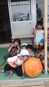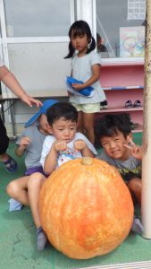 地域にお住まいの何原さんとが「珍しいので子どもたちが喜ぶかな?と思って・・・」と飾り用の大きなかぼちゃを持ってきてくださいました。
