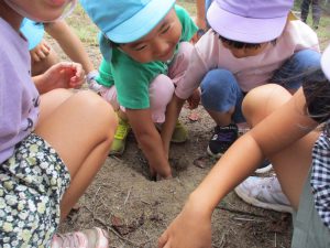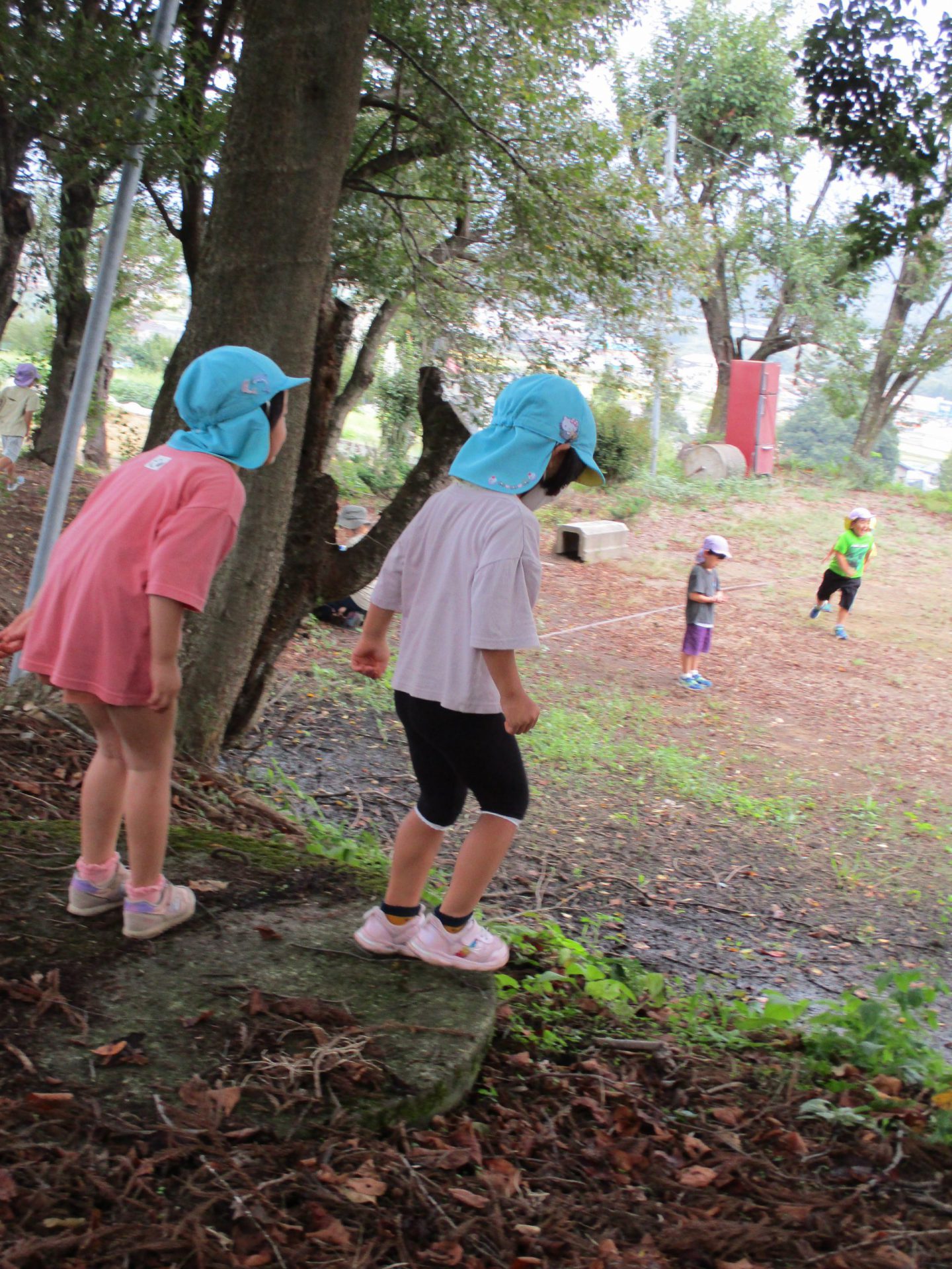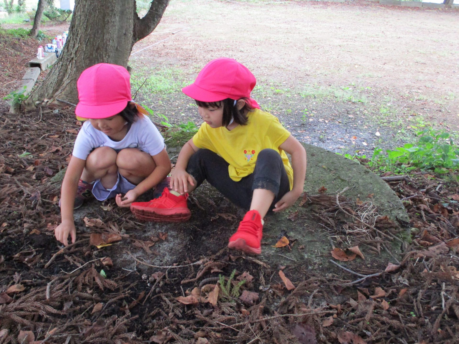 ・何度も遊んでいる馴染みのある神社で季節の変化に気付き、子ども同士で遊びを考えています。