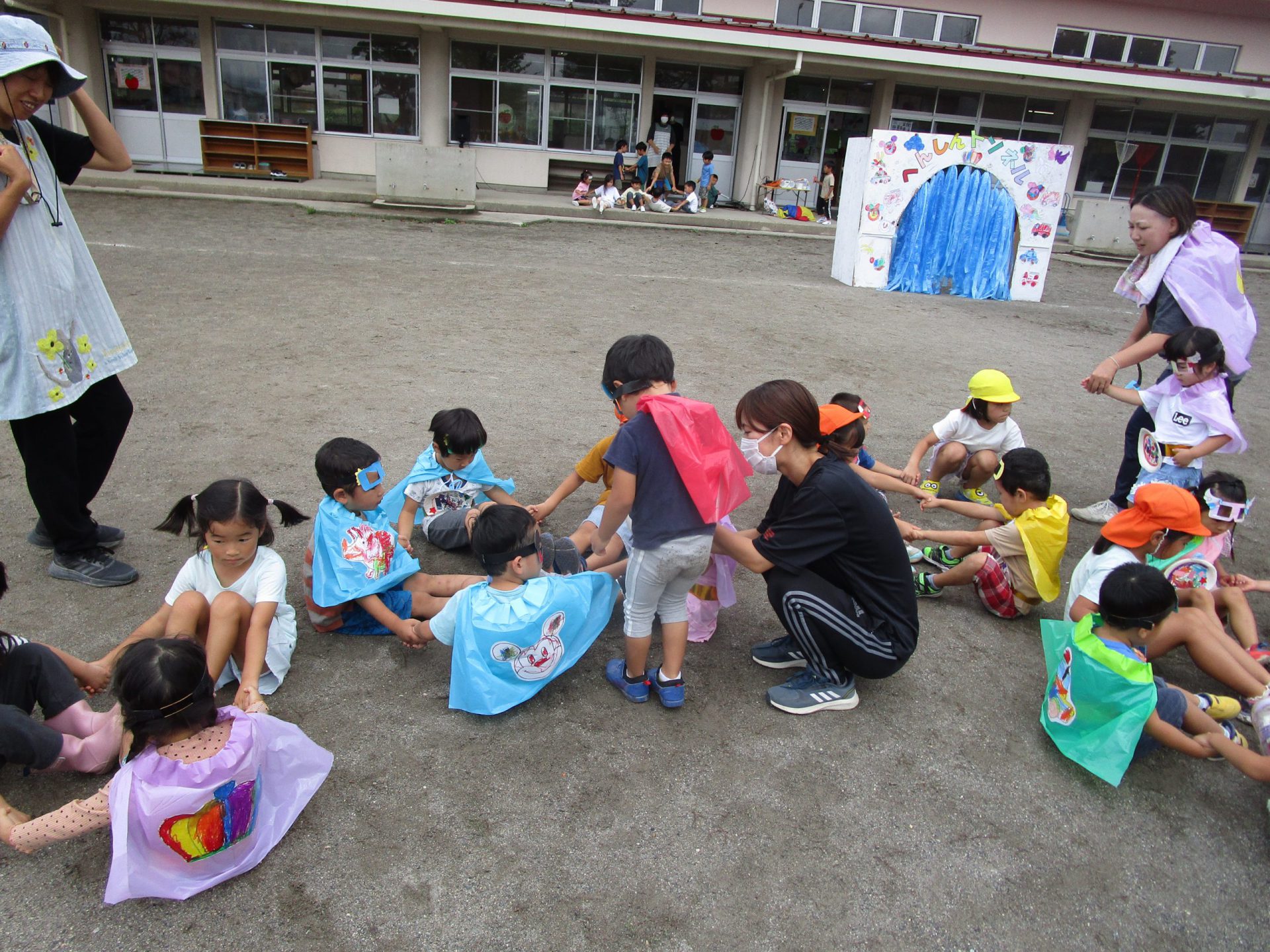 運動会で使ったトンネルを再利用しドアに見立ててままごと遊びをしました。