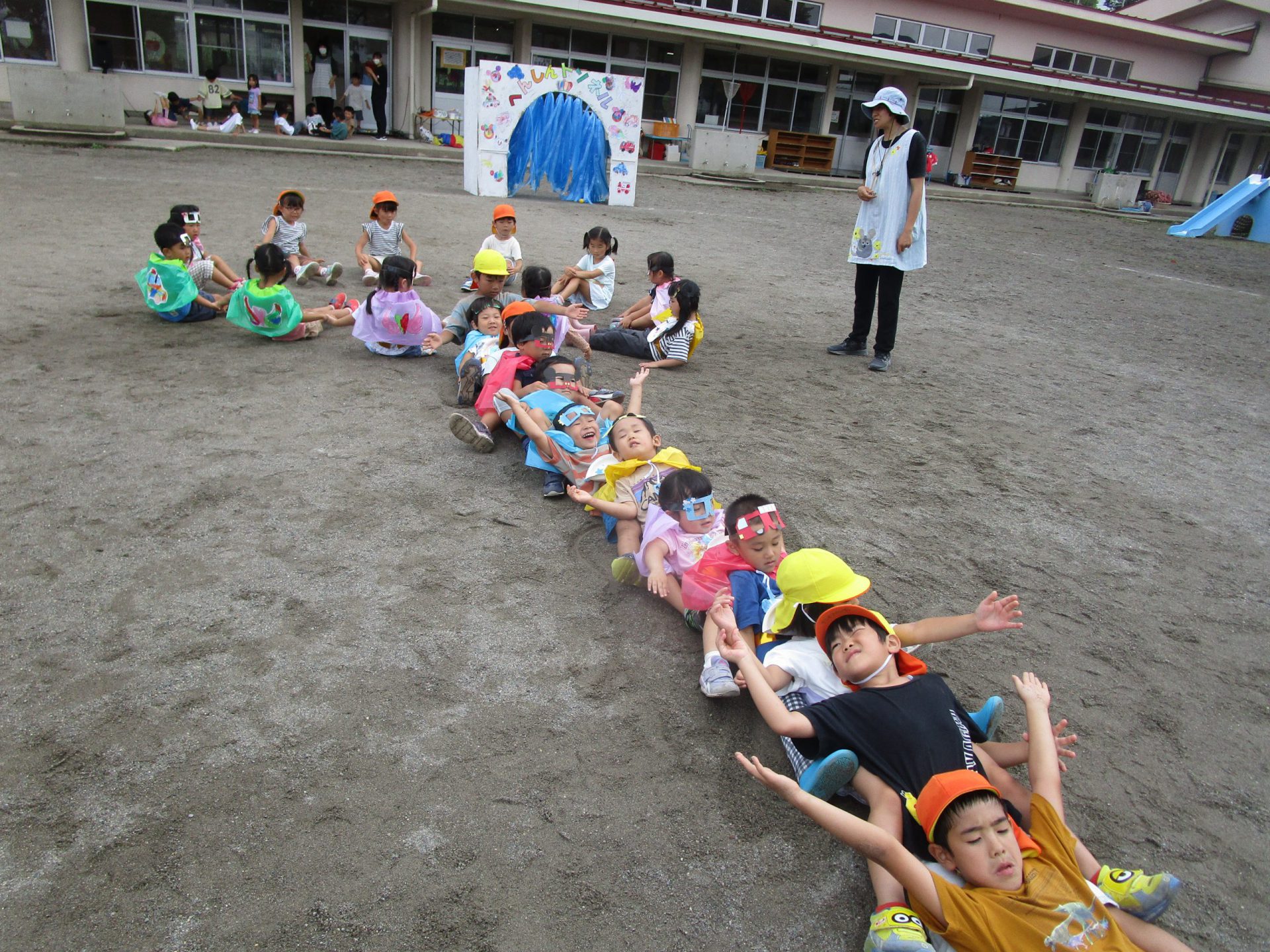 一番最初の競技から曲を流し、踊ったりパラバルーンをしたりし、組体操の曲になりました。