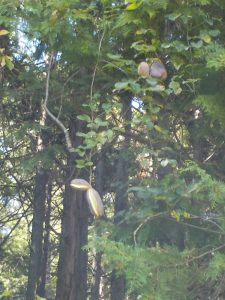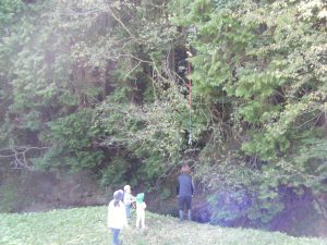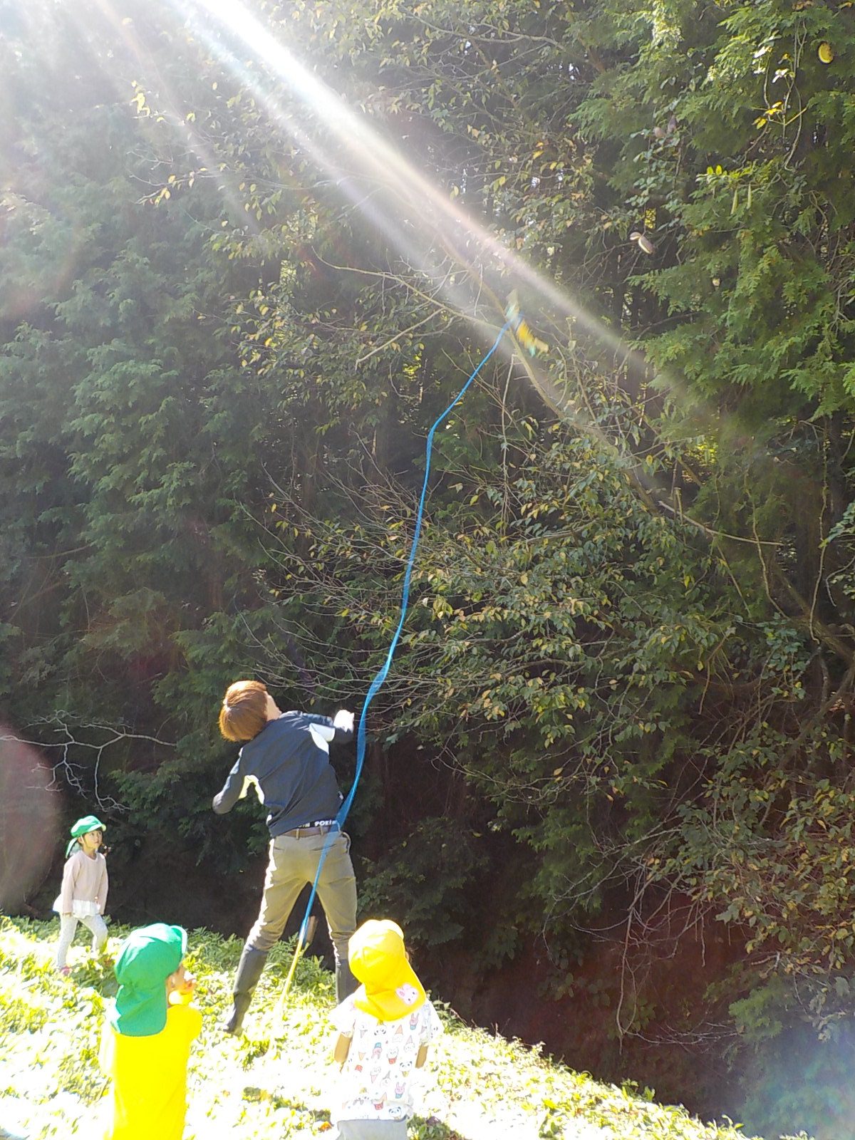 見事!引っ掛かりました!!だけど・・・アケビは落ちてきませんでした。「向こうから行ってみよう」と対岸の崖に行ってみるものの、急勾配で無理だとわかったり、水鉄砲に水を入れて当ててみようとしますが「全然届かんわ」とあきらめたり。