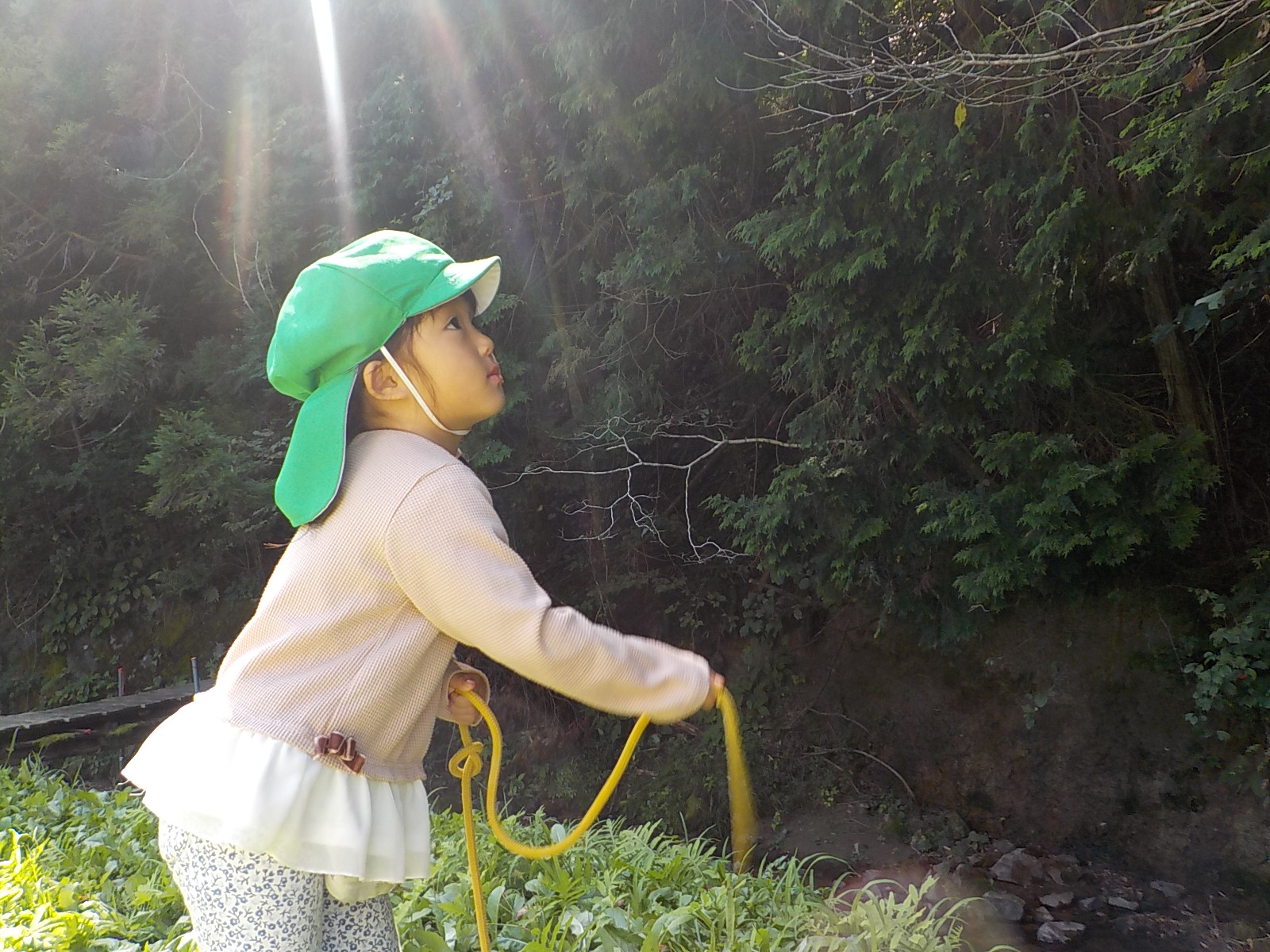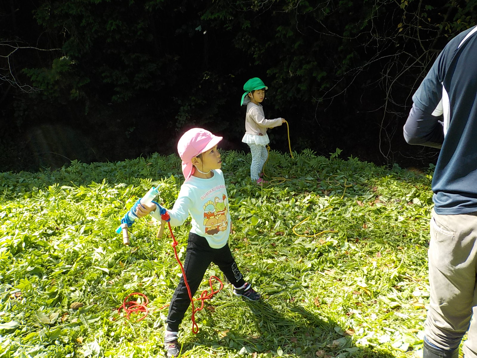 年長児と年中児は「何か引っ掛かるものが必要」と水鉄砲を探して持ってきました。「ここが引っ掛かるんじゃない?」「投げて引っ掛けよう」と水鉄砲の先端に縄を巻き付けて投げてみます。