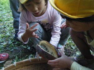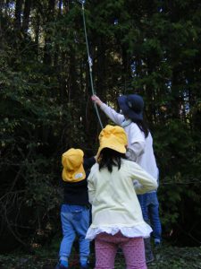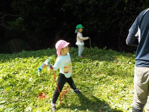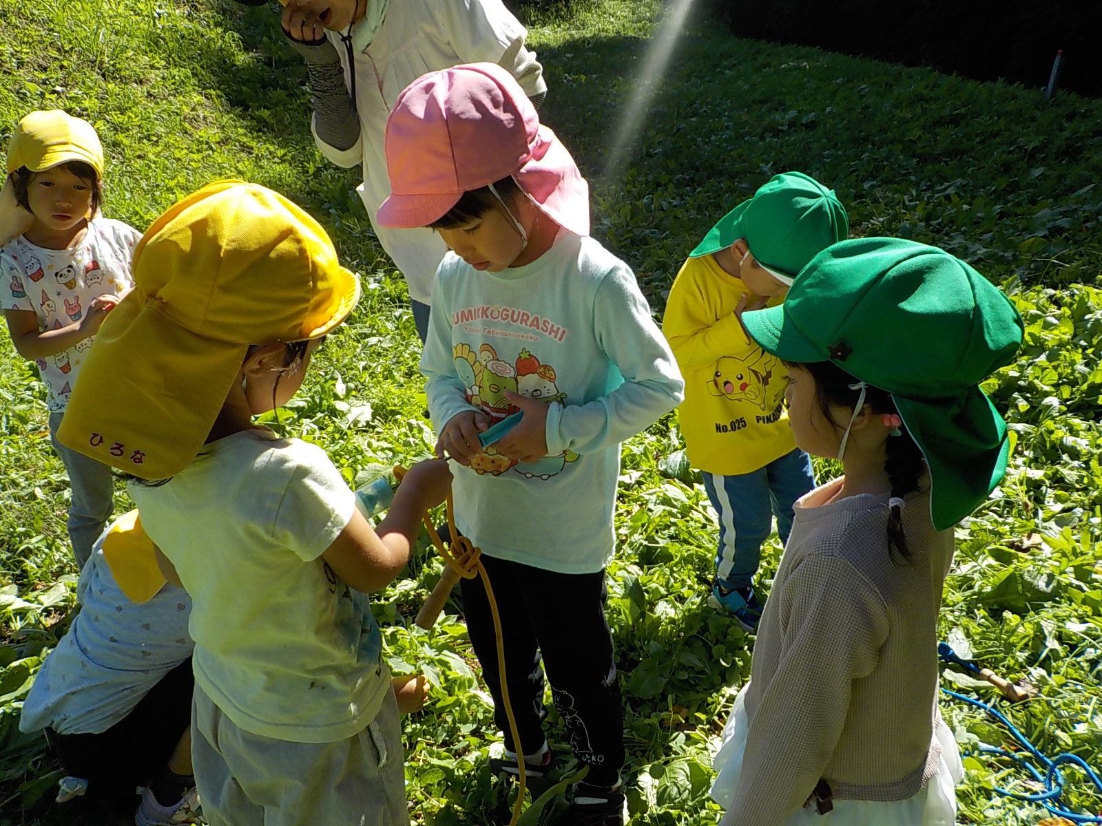・アケビを見つけ取ろうと試行錯誤する中で、「こうしたらどうか」「こうやってみよう」と考えて、試してみる姿がたくさんありました。自分自身で考え試すことも大事だし、異年齢の関わりの中で友だちと一緒に考えたり、友だちの考えを受け入れたり、すごいなと思ったりすることも、取れた時の喜びを、みんなで共感し合あえたことにつながったのではないかと感じます。