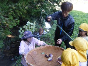 「今日こそ絶対取る!」と決意して向かいます。「長い棒を縄に引っ掛けたらとれるんじゃない?」と探してきた2本の棒をガムテープでつなぎ合わせ、その先にハンガーをくっつけて縄に引っ掛かるようにしました。取れたアケビが川に落ちないようにと下に大きなざるを持ってスタンバイ。うまい具合に引っ掛かり、みんなで引っ張ると・・・