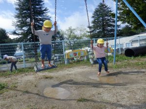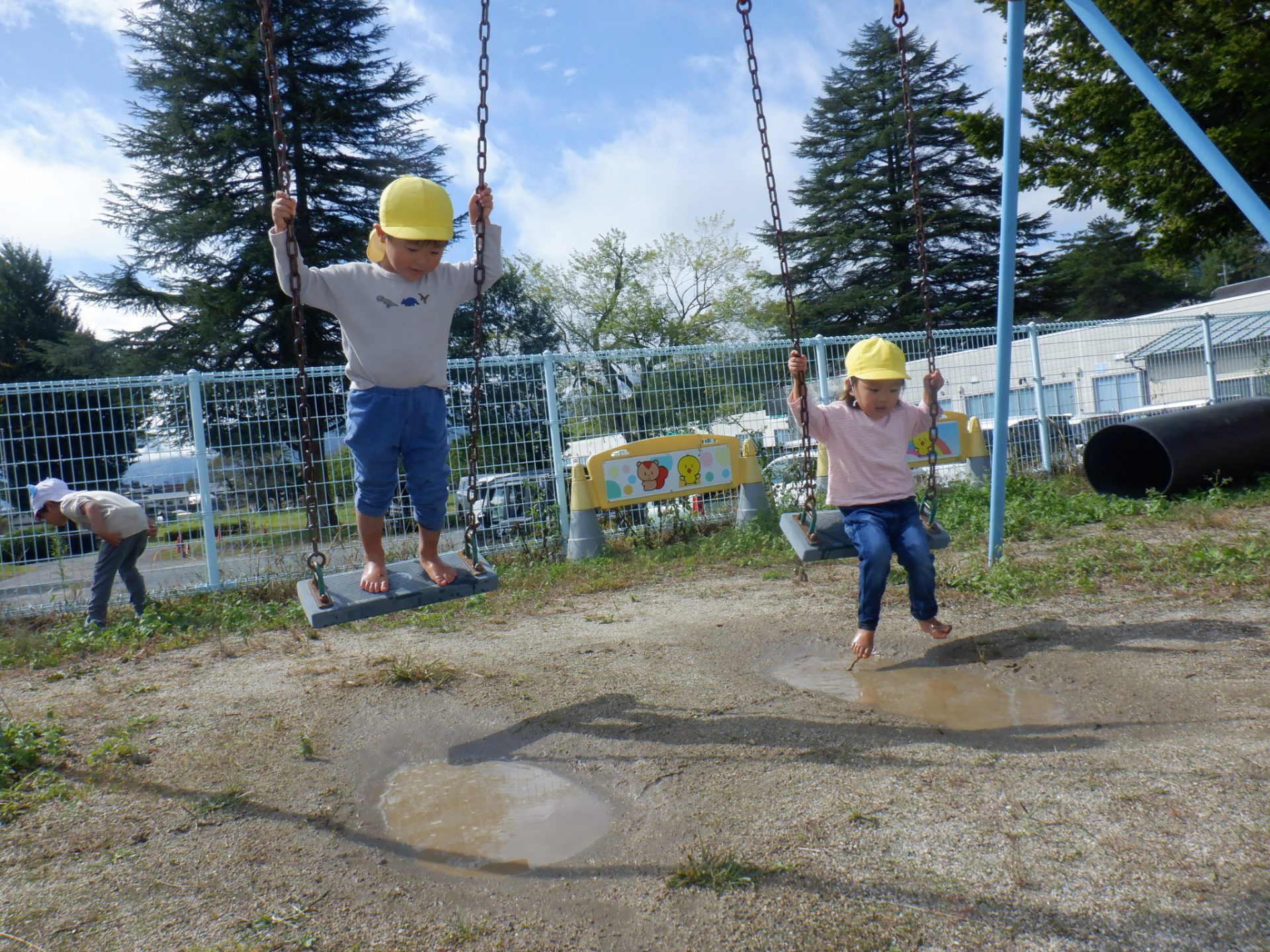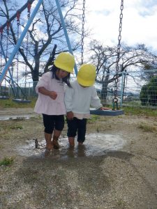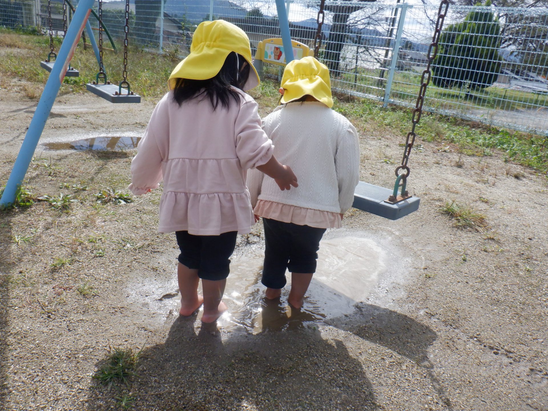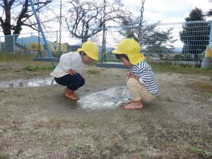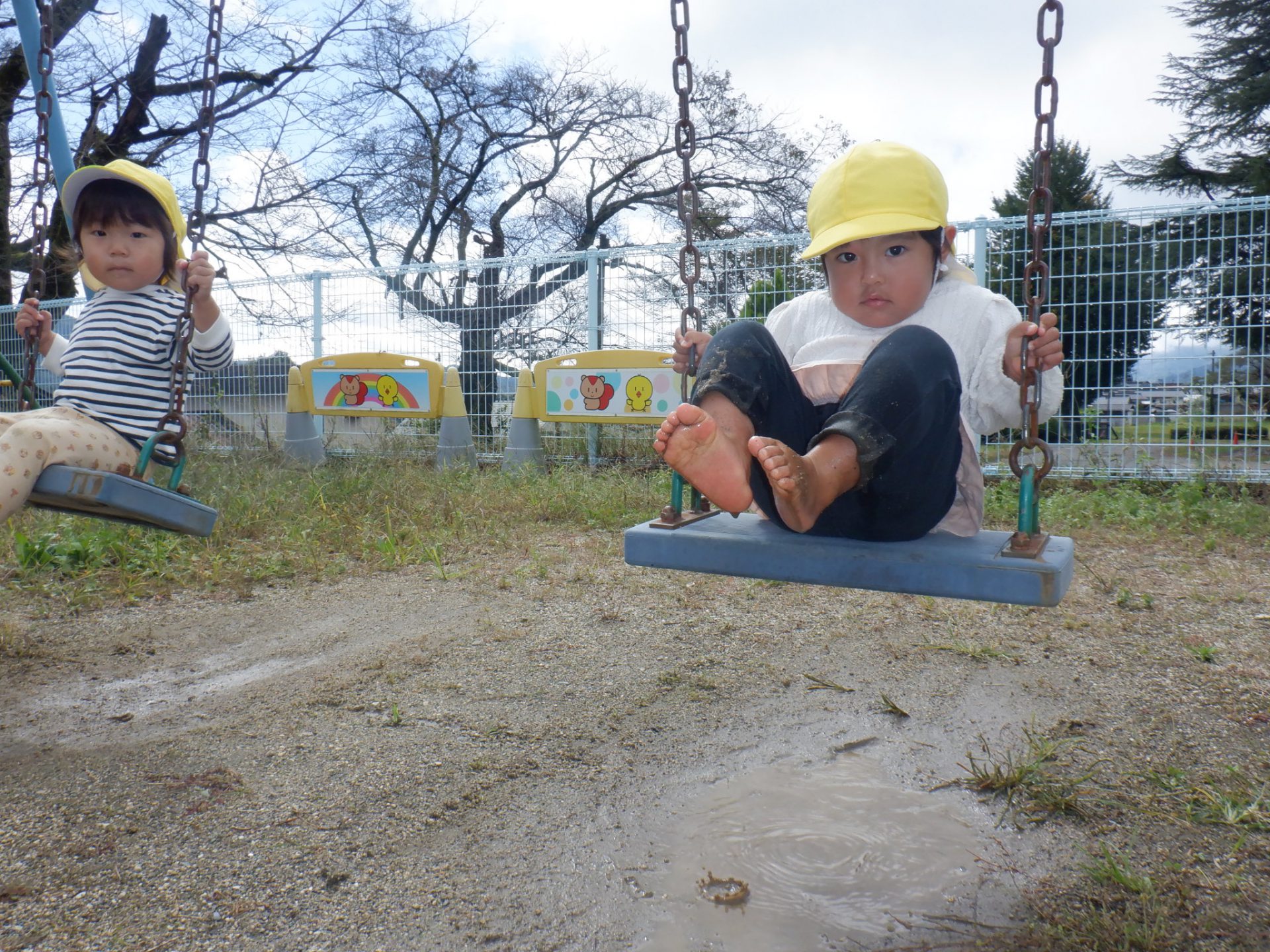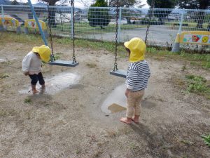 水たまりを見つけた子どもたち、水の魅力は夏でも秋でも同じ、さっそく入って感触を味わい、水たまりの中がどうなっているのかを観察したり、触れることで水の動きが不思議だったり、最後にはどうやれば濡れずにブランコに乗れるかも考えしたりして、小さな水たまりにも未満児さんにはたくさんの発見がありました。