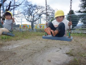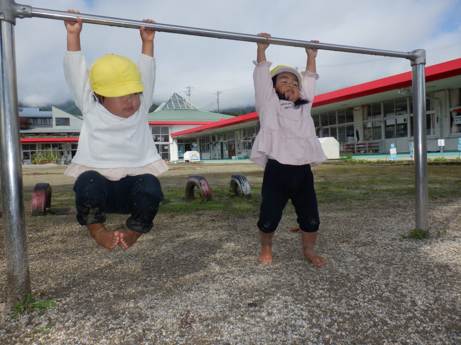 ブランコに満足したり、大きいお友だちの真似をして鉄棒にぶら下がります。