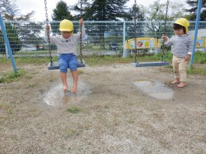 ブランコに乗ってゆらゆら揺らすと水たまりの水が動いたり、はねたり。おもしろいな!