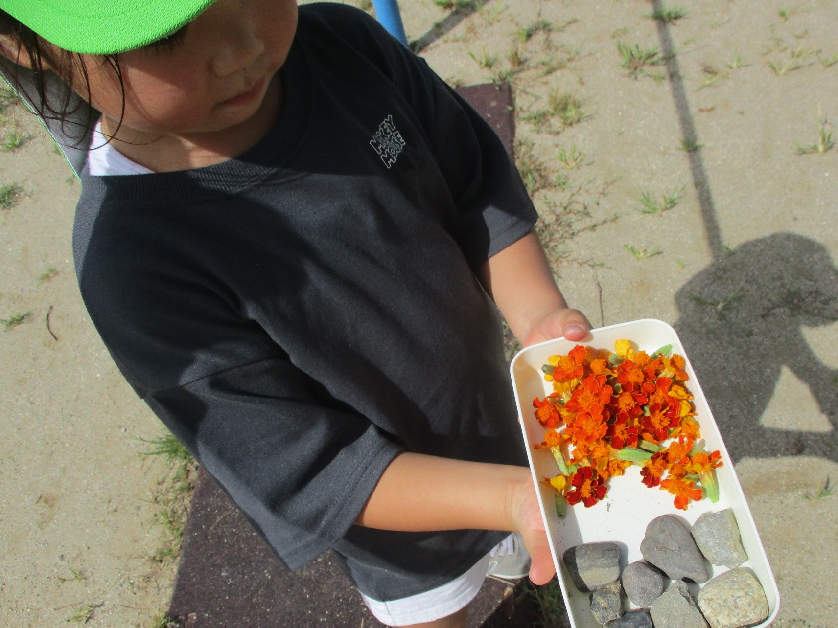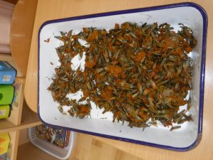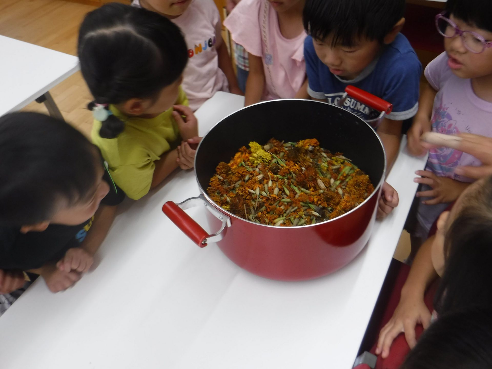 今回に至るまで、七夕制作や夏の色水遊びでも、マリーゴールドの花を使って遊んできました。