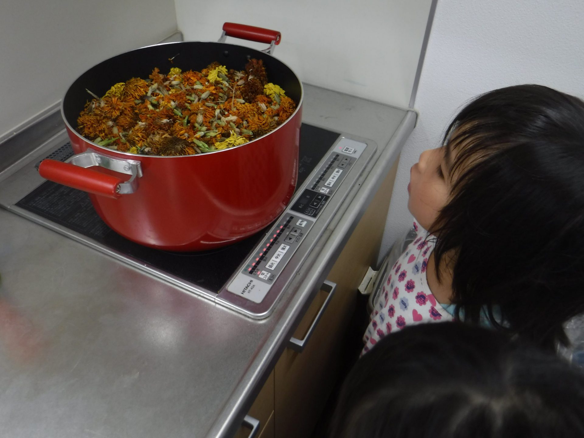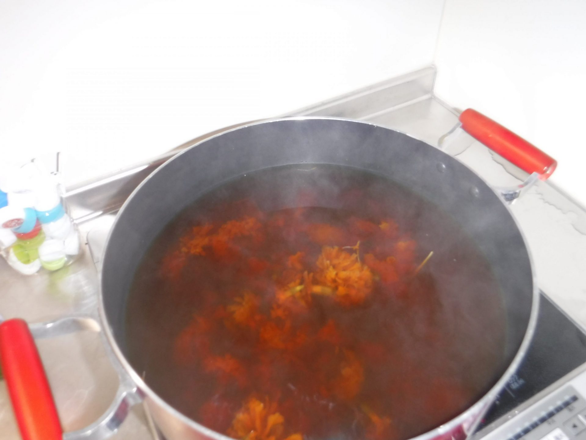 マリーゴールドは大きな鍋に入れ、グツグツ煮ました。