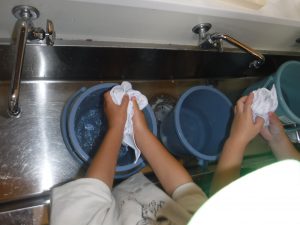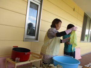 「一度洗うと、いっぱい染まるよね!」と今までの経験から、染める布を水洗いして準備しています・・・
