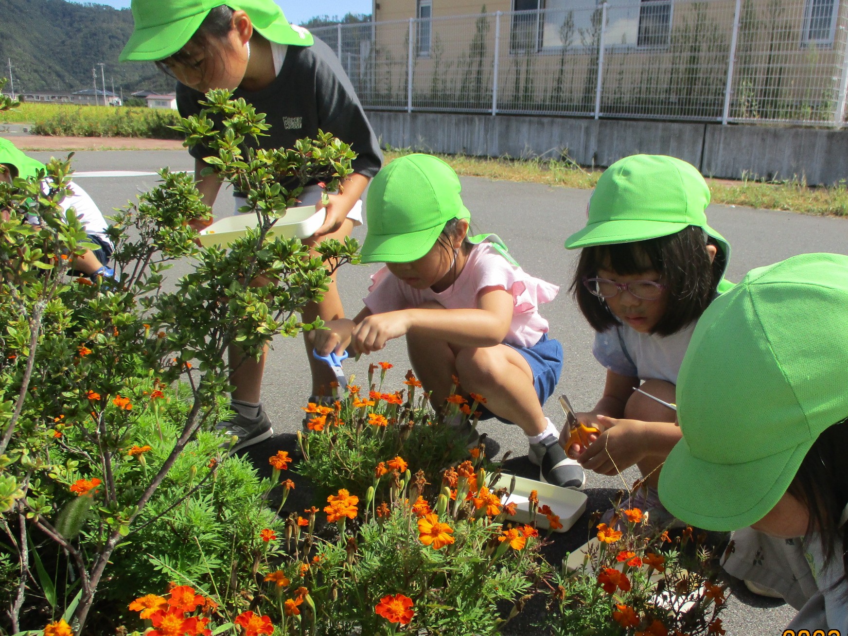 自分達で種や苗から育てたマリーゴールドの花を摘んで集めました。