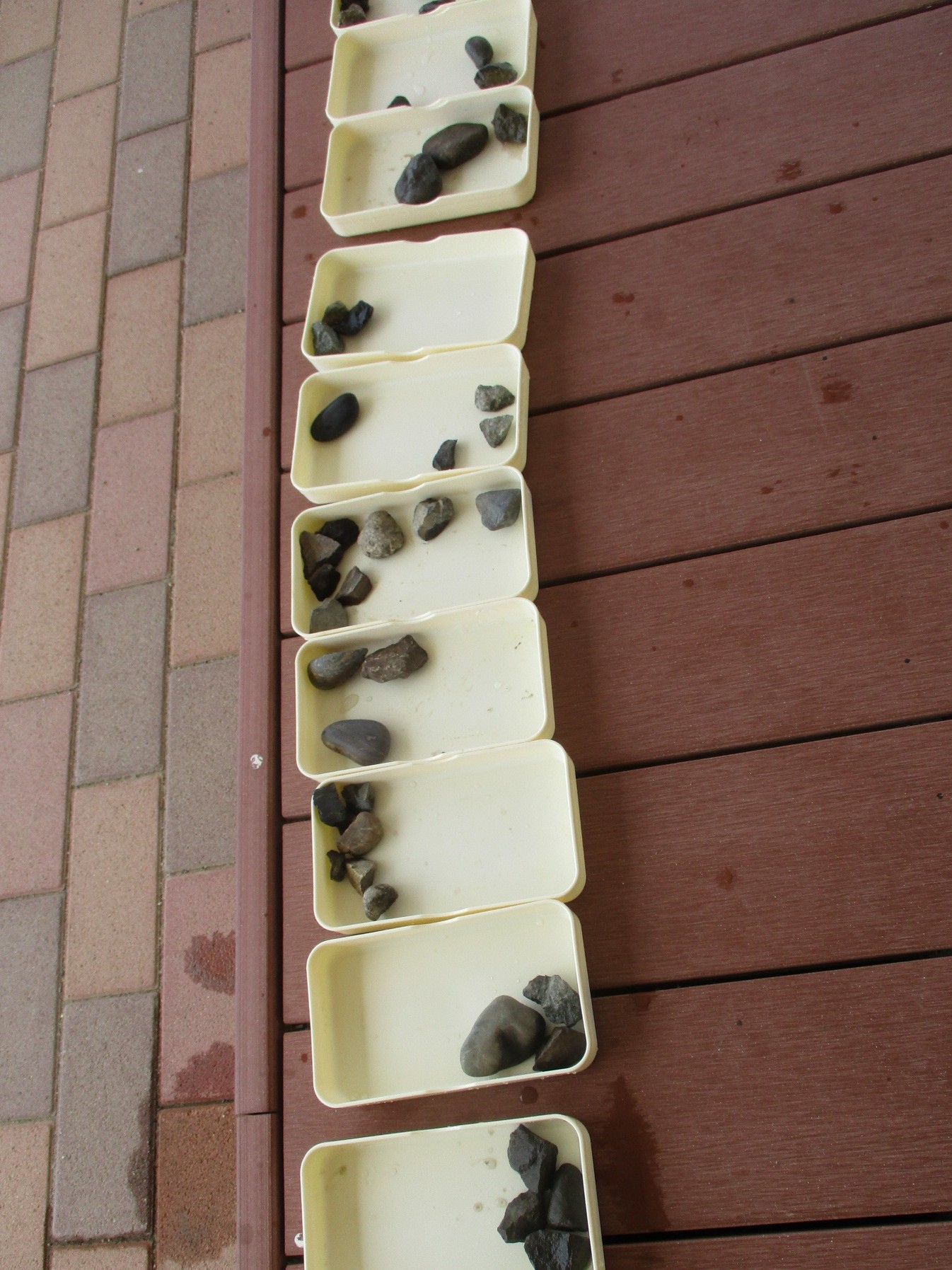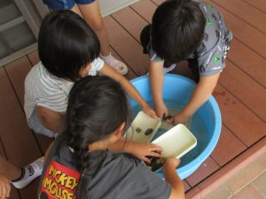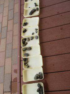 模様をつけるために園庭の石を集め、きれいに洗って準備しました。