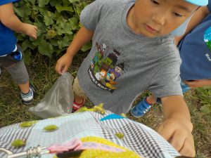 「いくつ くっついたか数えてみようよ!1.2.3.4…と、くっつきむしに興味津々の子どもたち。