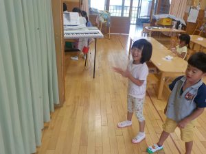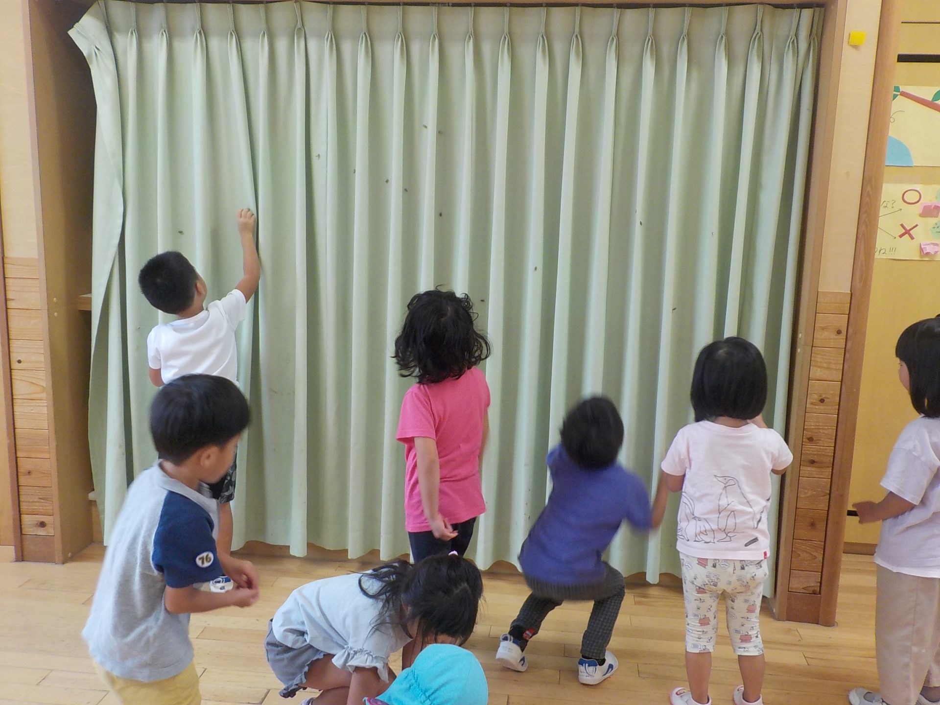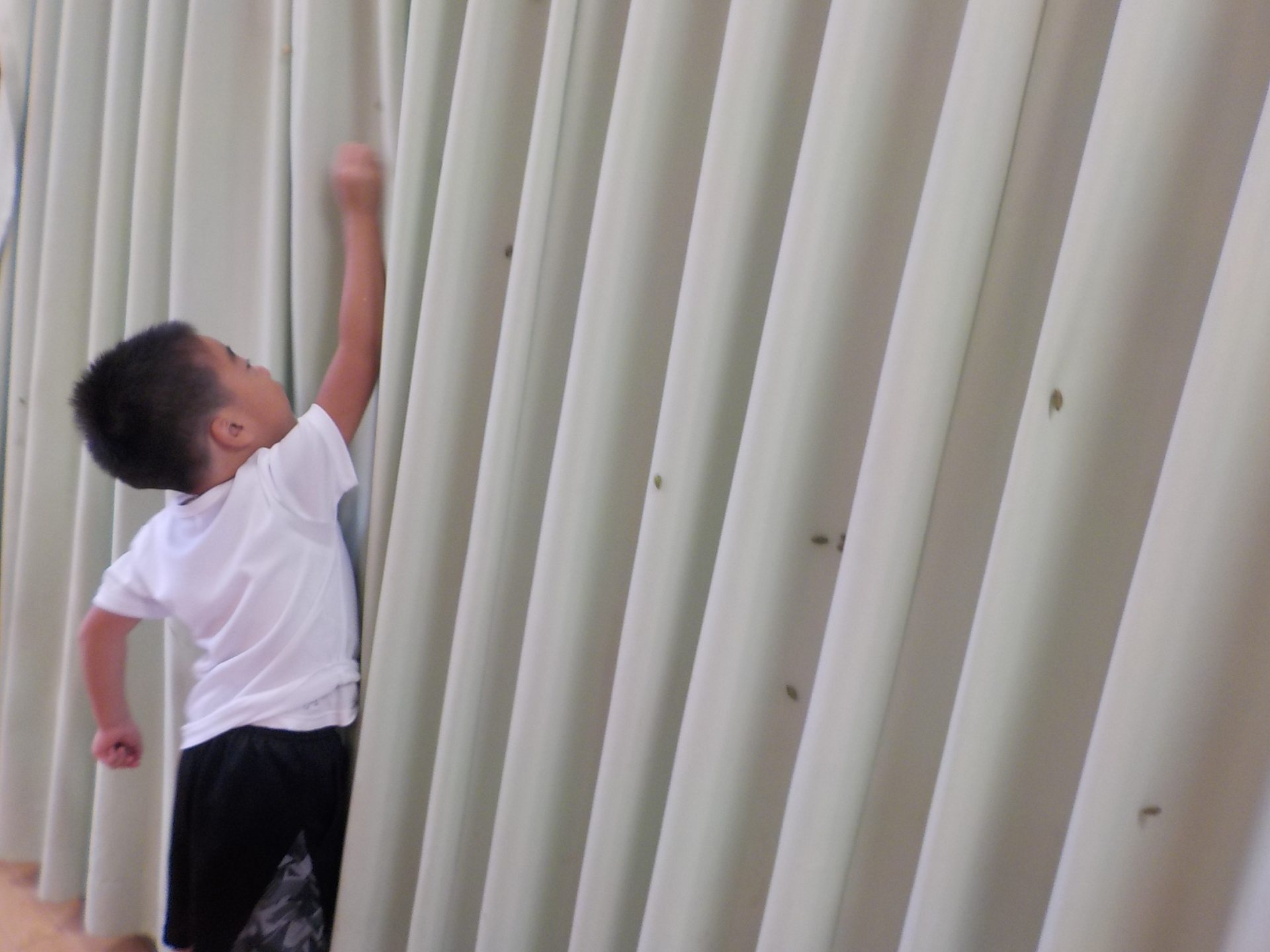 沢山集めて・・・クラスのカーテンで的あてゲームが始まりました!