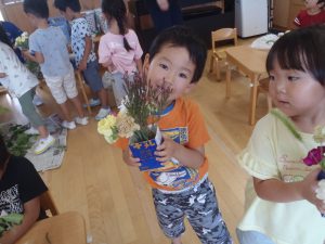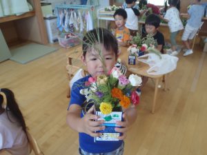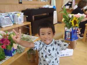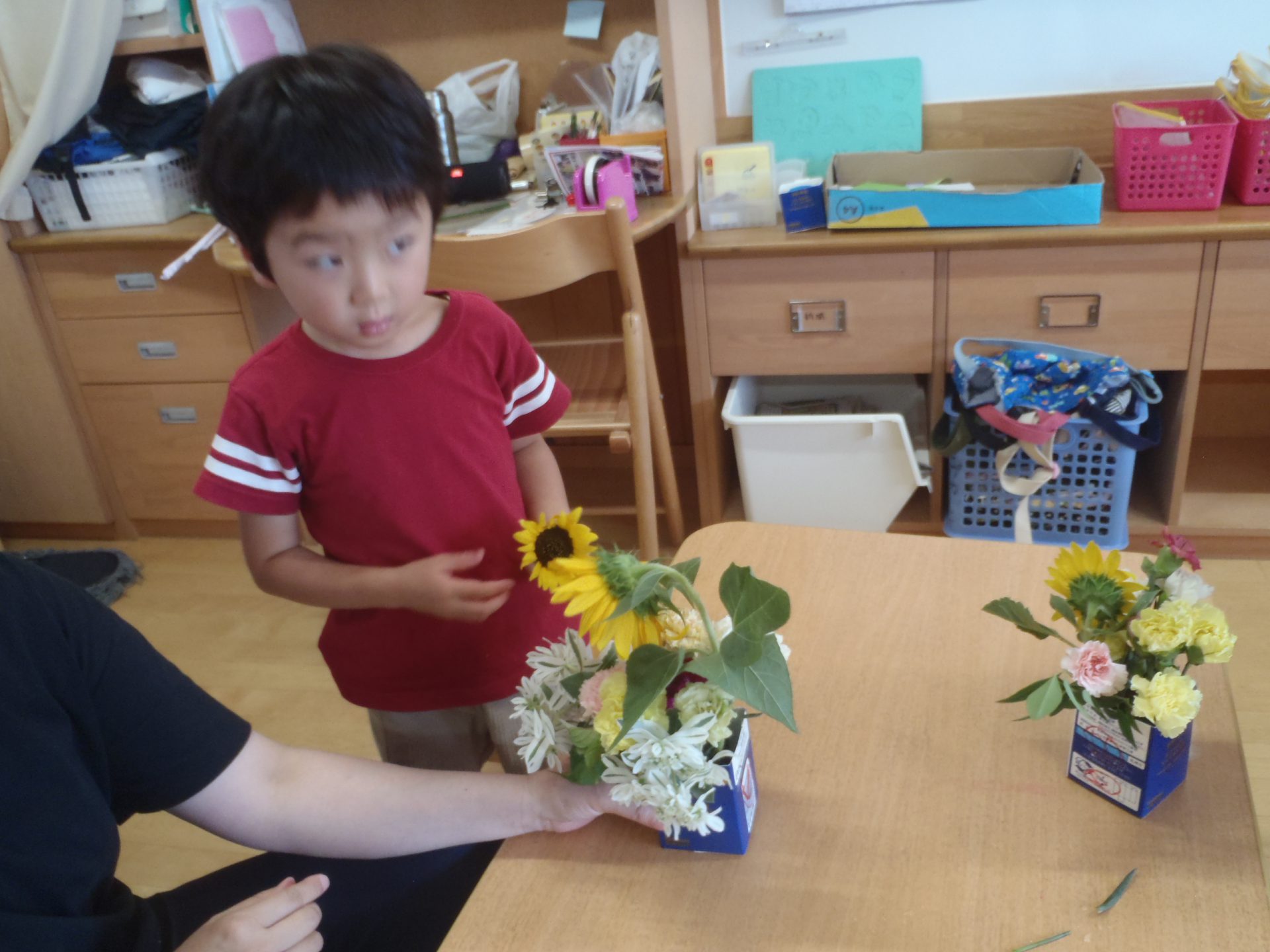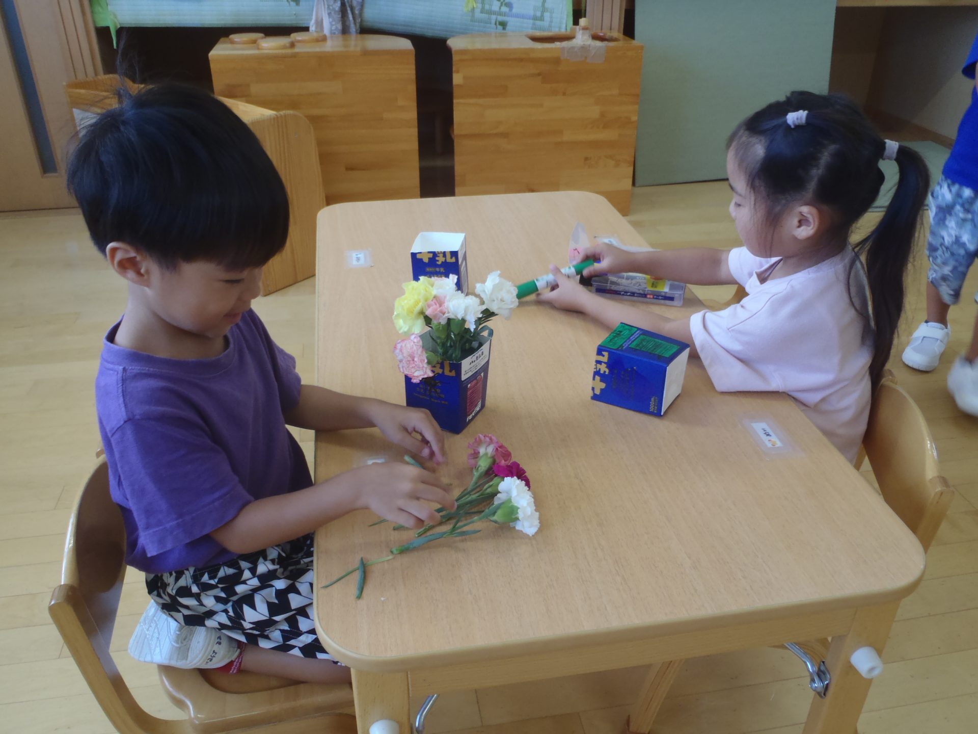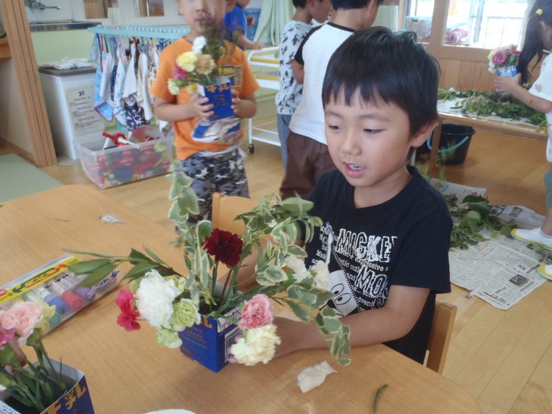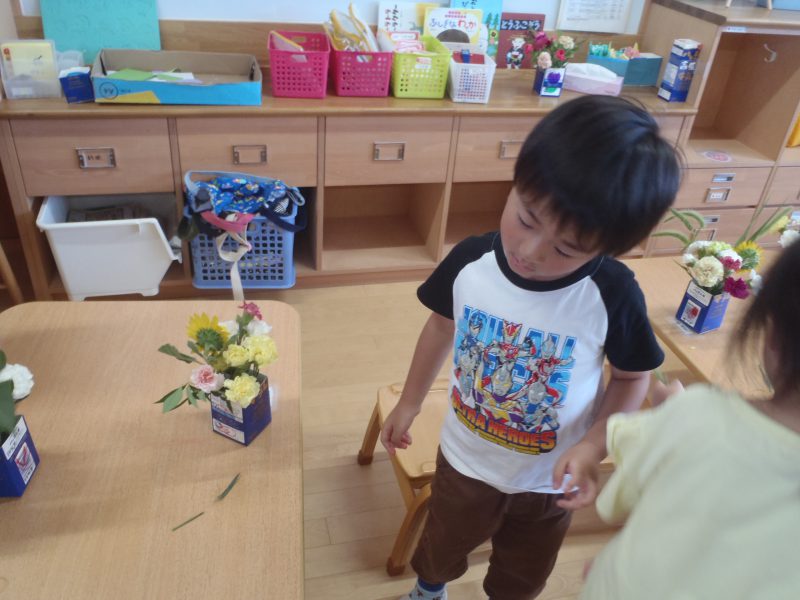 どうやって飾ったら上手にできるか、何回もさし直してみる子もいました。満足行くまで試すことができる時間が、とても楽しそうでした。