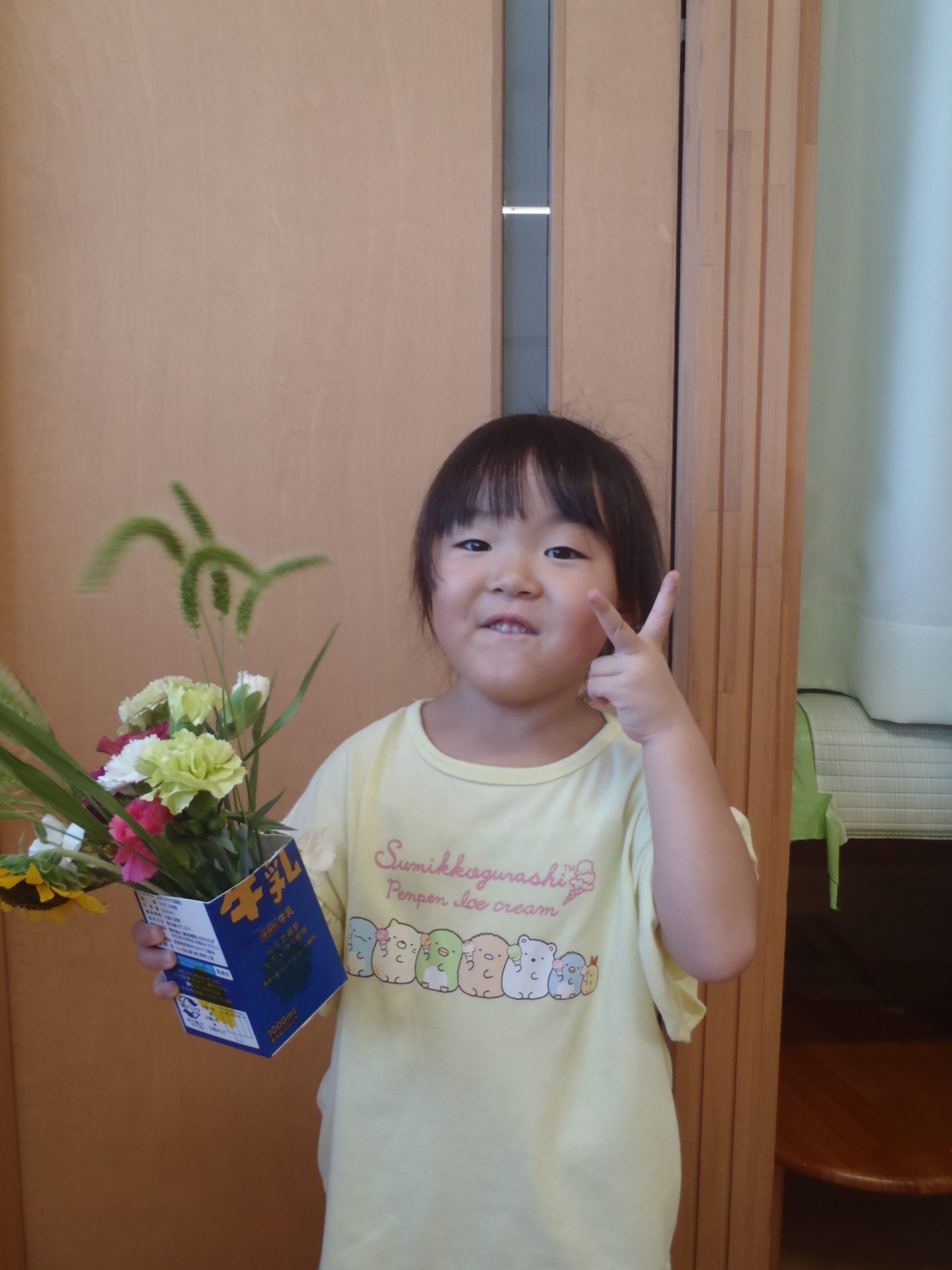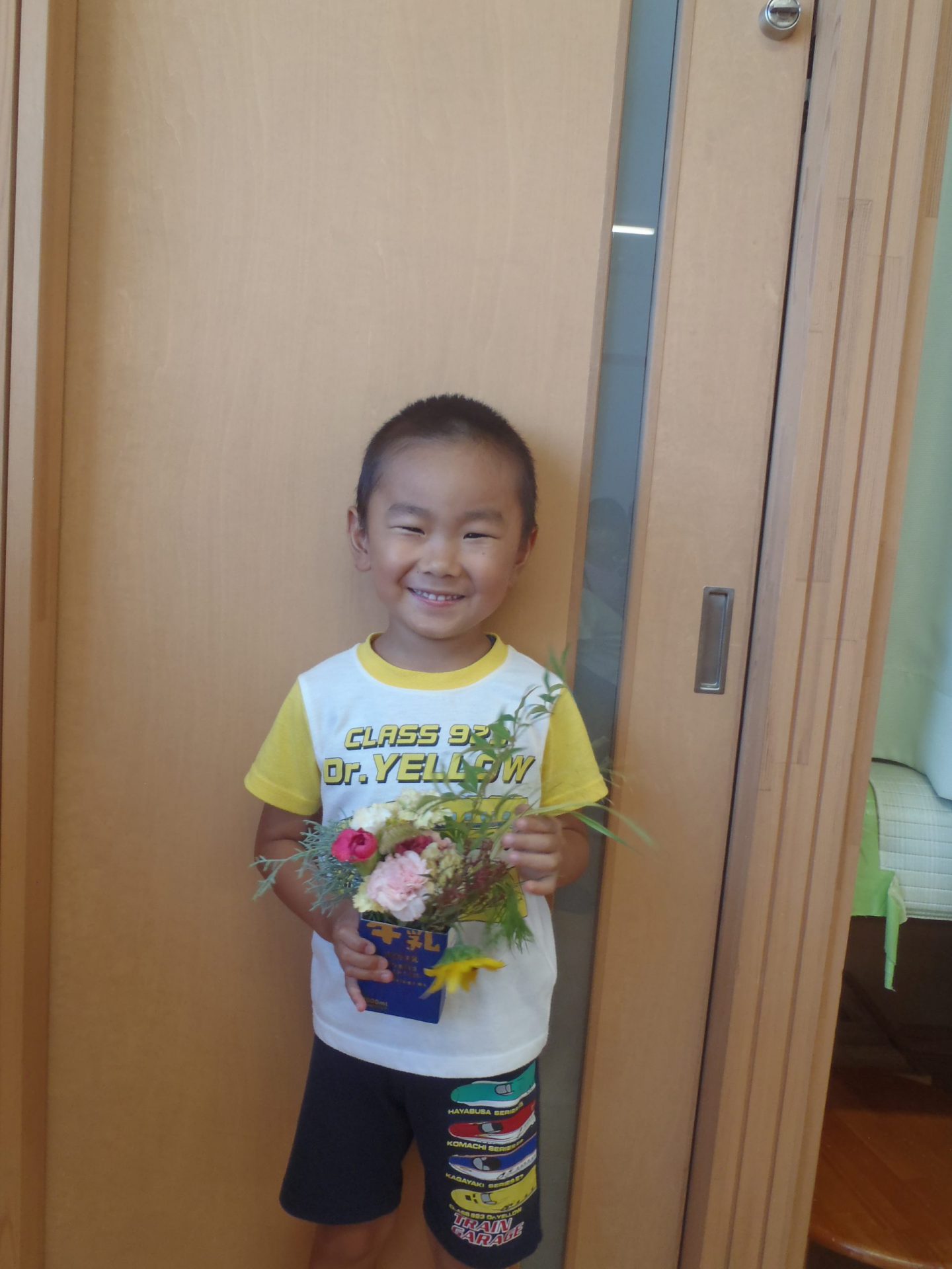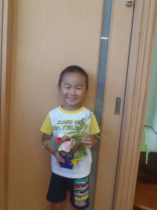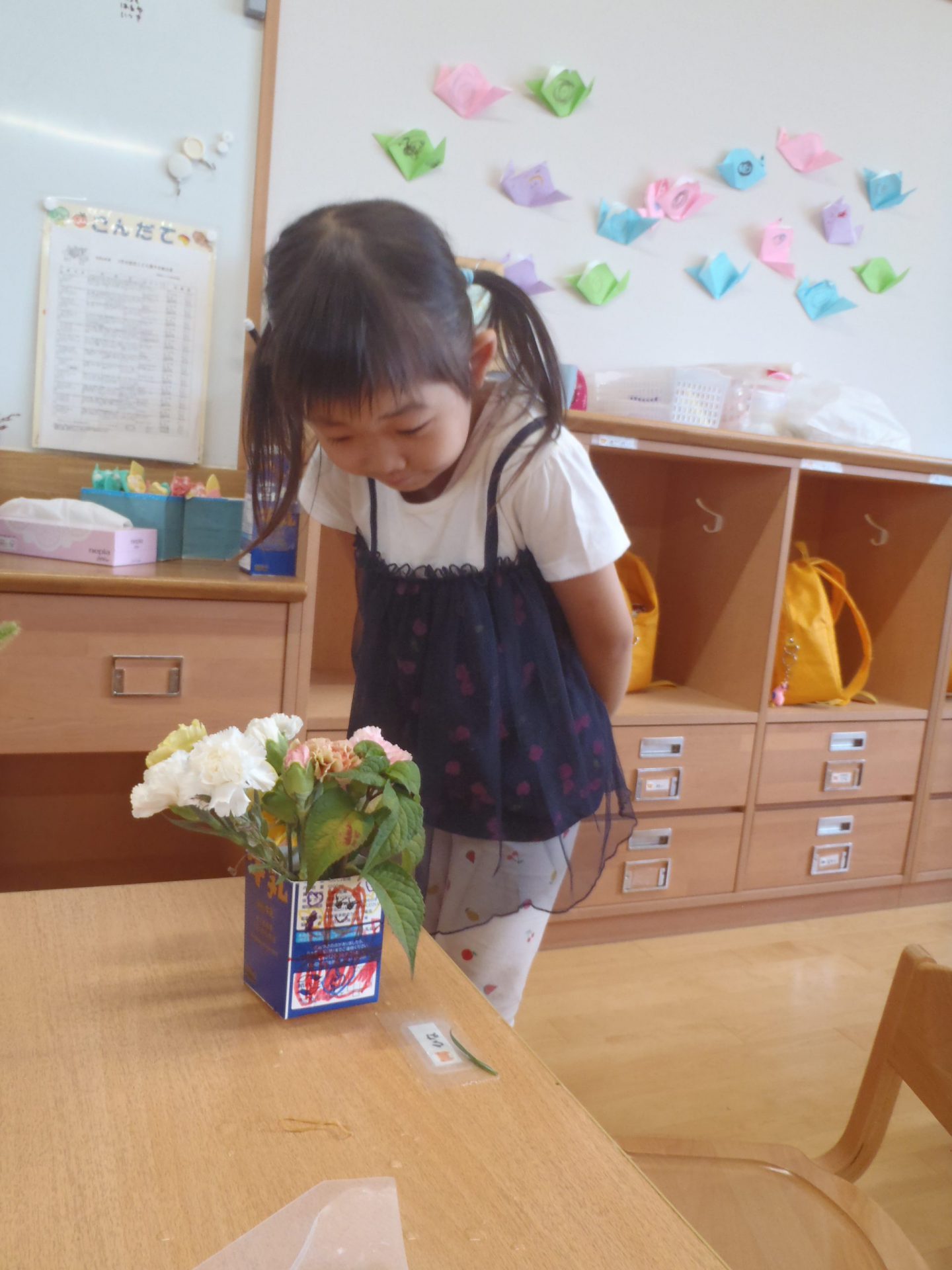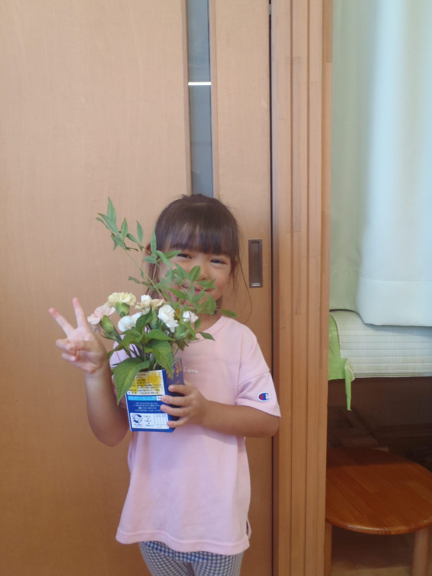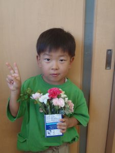 毎年恒例となっている、たつみ認定こども園のフラワー・アレンジメント。今年度も地域の方からのご厚意で、カーネーションをいただき、それぞれのクラスで楽しみました。