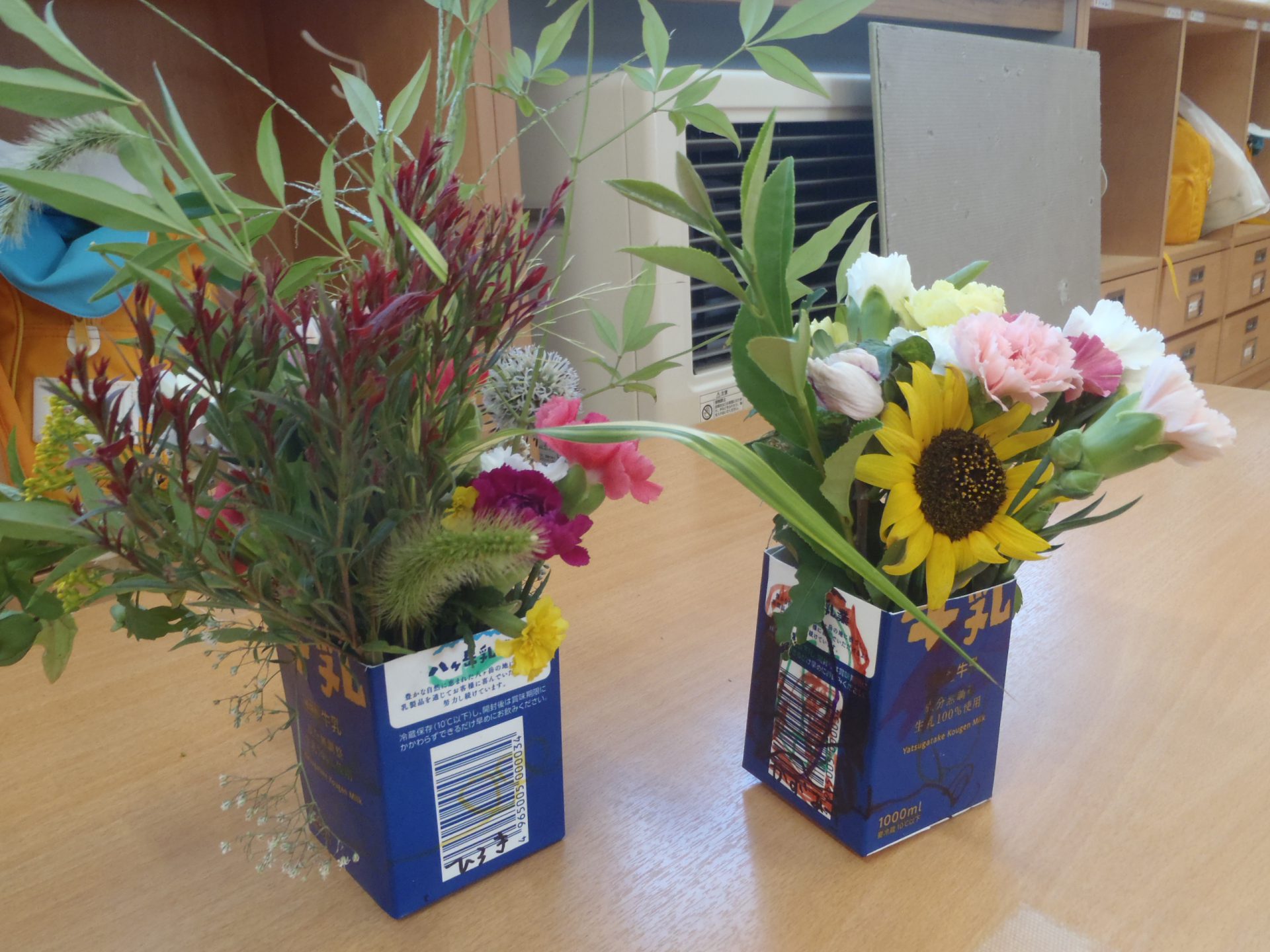 フラワーアレンジメント、なんだか少し難しそうだなあ、と思うのは大人の感覚で、子どもたちは本当に感性豊かで、花を飾ることを楽しんでいました。隣の友達の作品が気になる事もありましたが、一人ひとり、個性的な作品ができました!