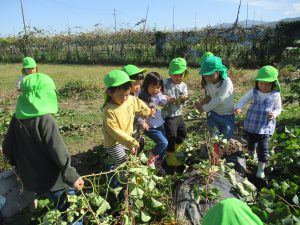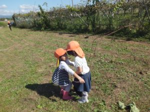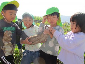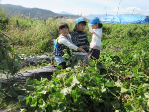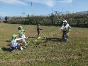 いも掘りが初めての、年少児。つる取りやつるで遊ぶ楽しさを伝えたいと考えました。なかなか抜けない時、「助けて!」「いいよ!」と友達と声をかけ合って抜こうとする姿に驚きました。運動会後だったため、綱引き遊びに展開し、楽しむことができました。