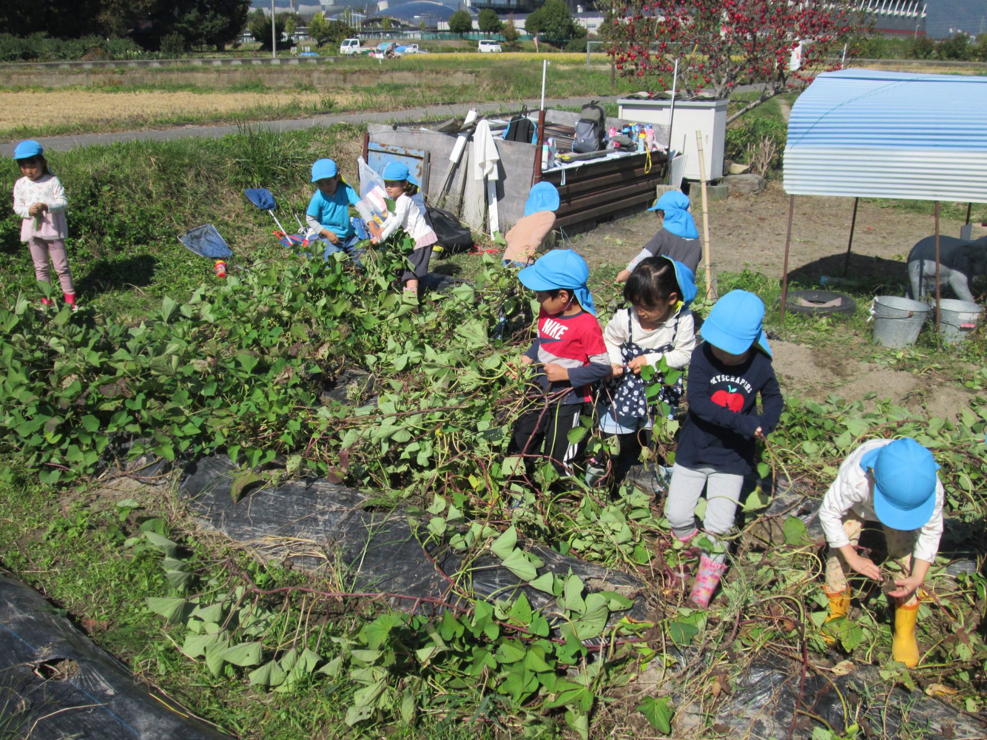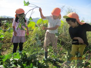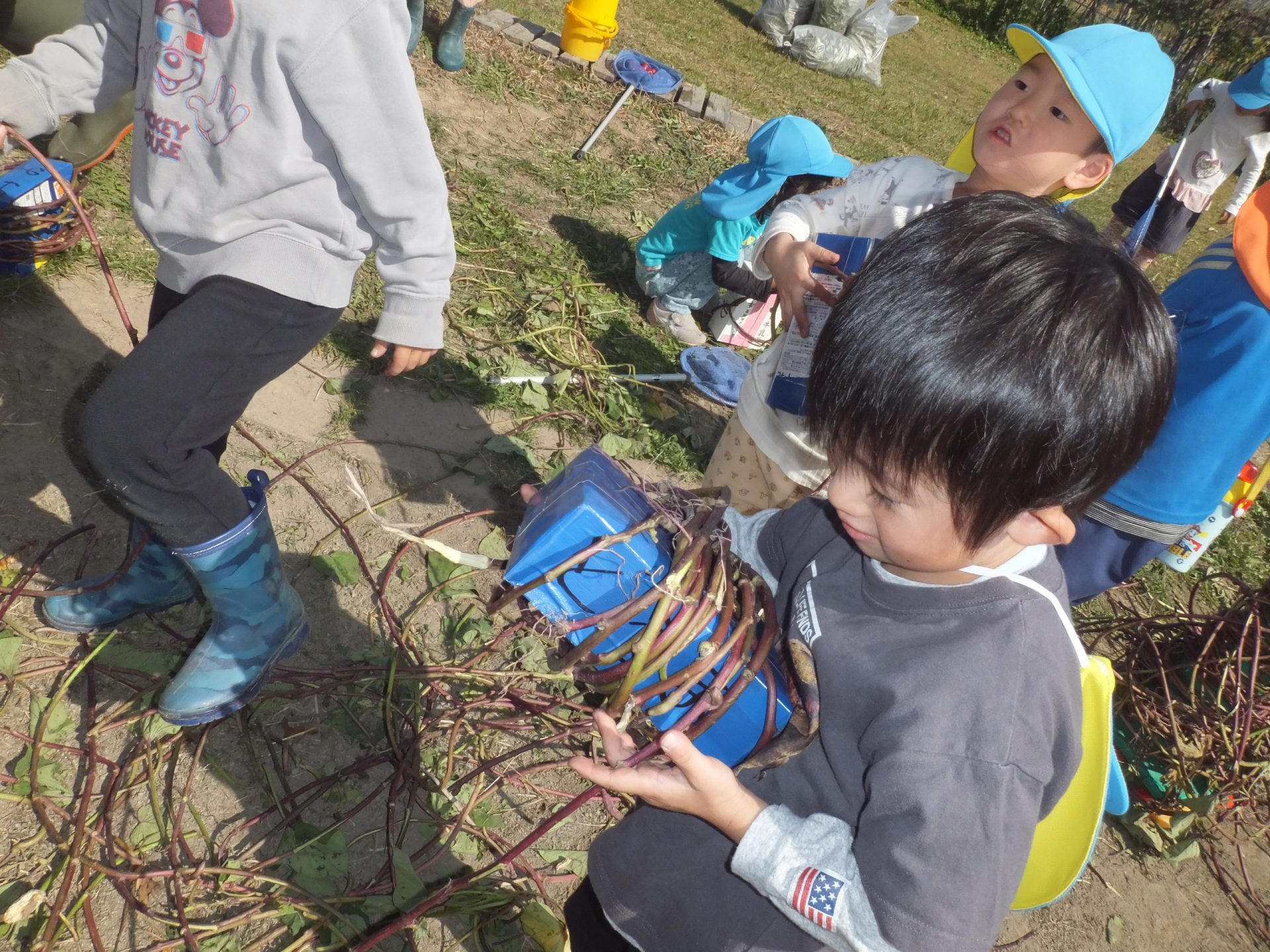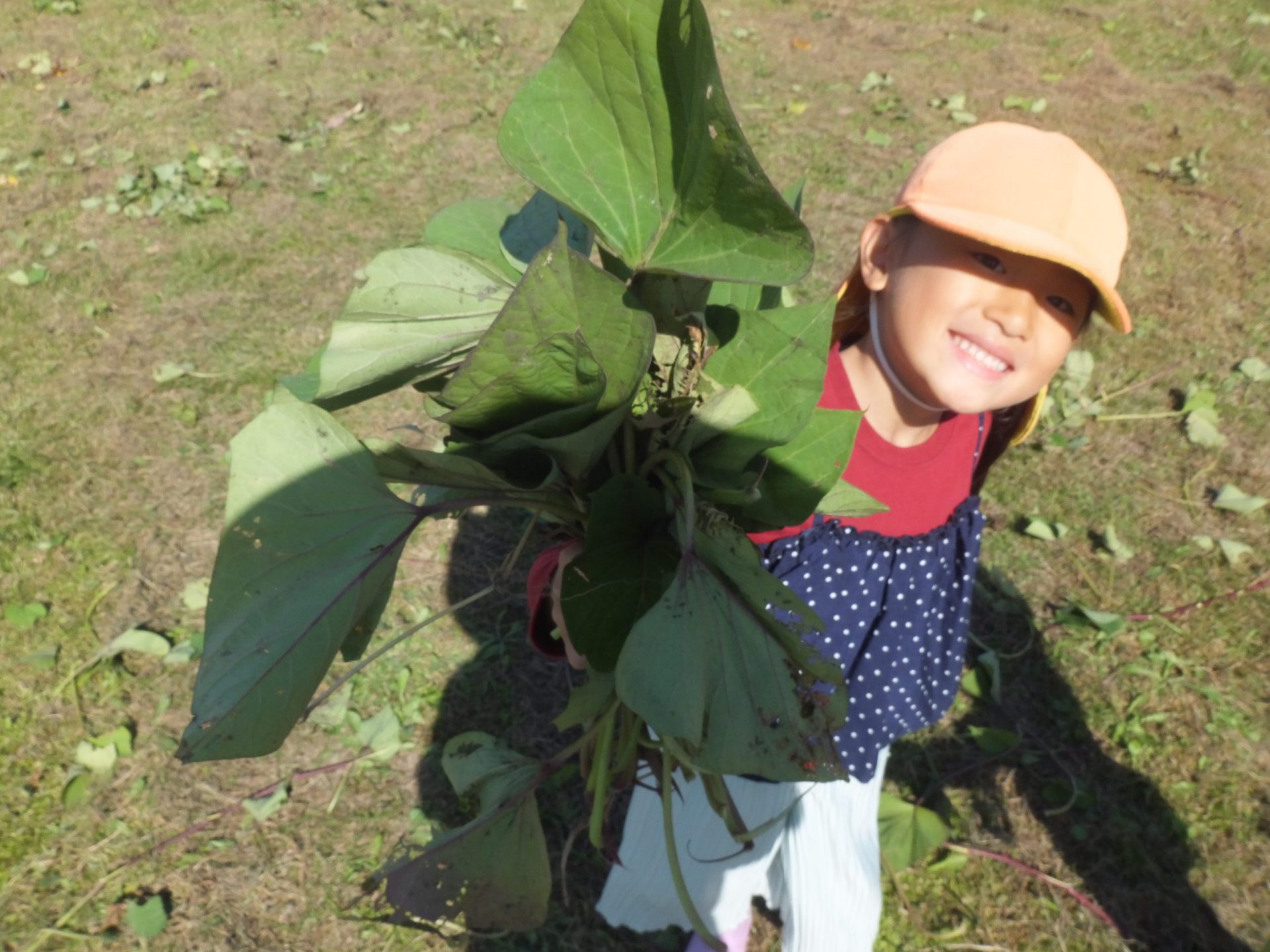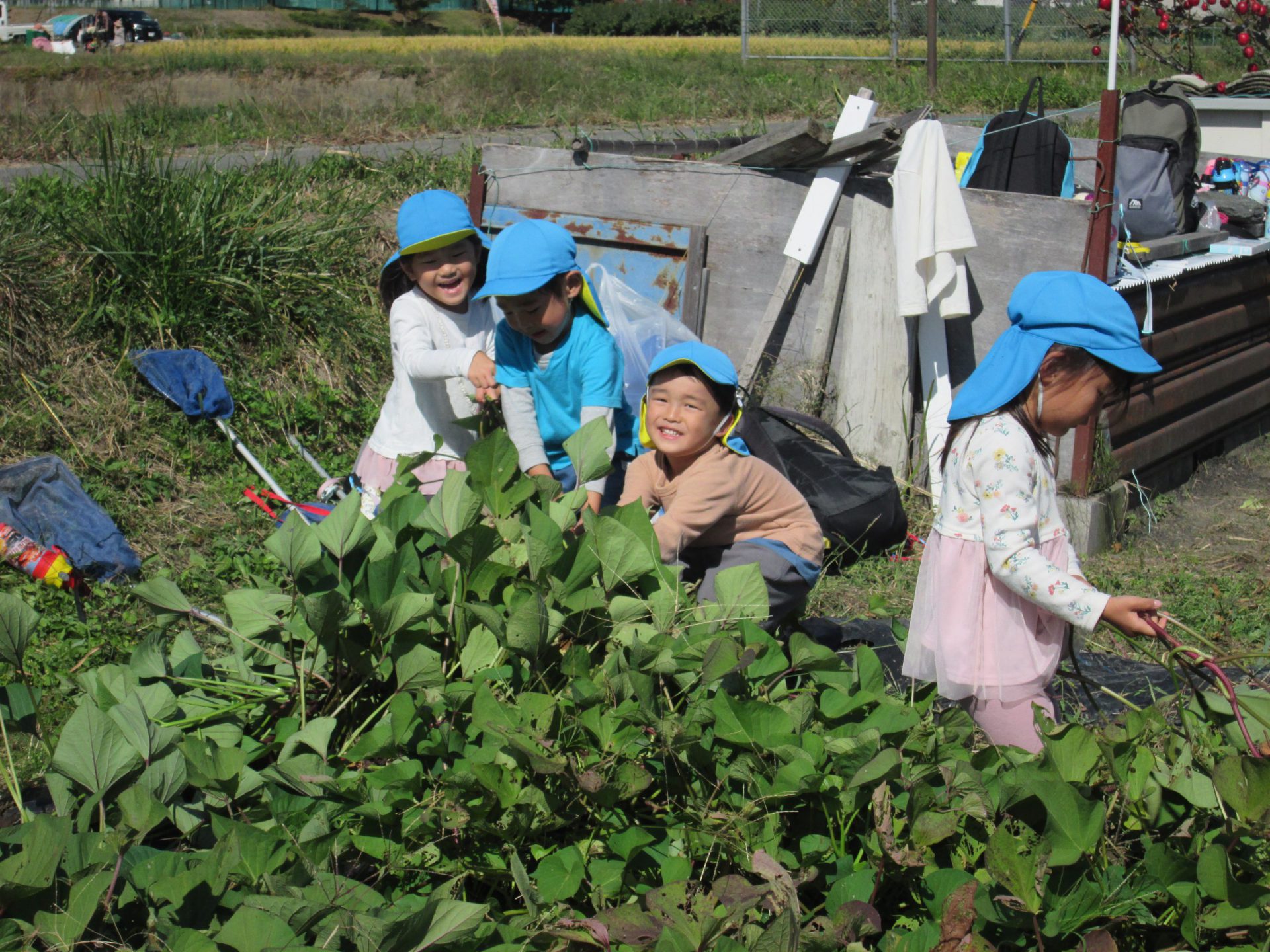 キラキラ太陽の下で、一生懸命さつまいものつる取りをしたり遊んだりして、汗ぐっしょりになるまで遊びました。