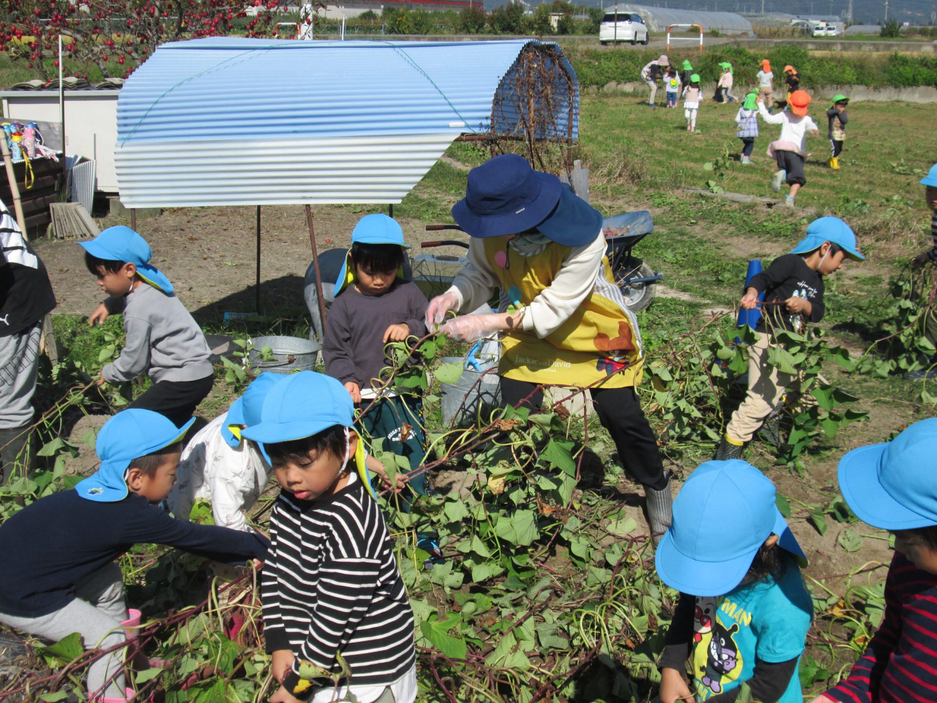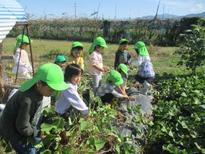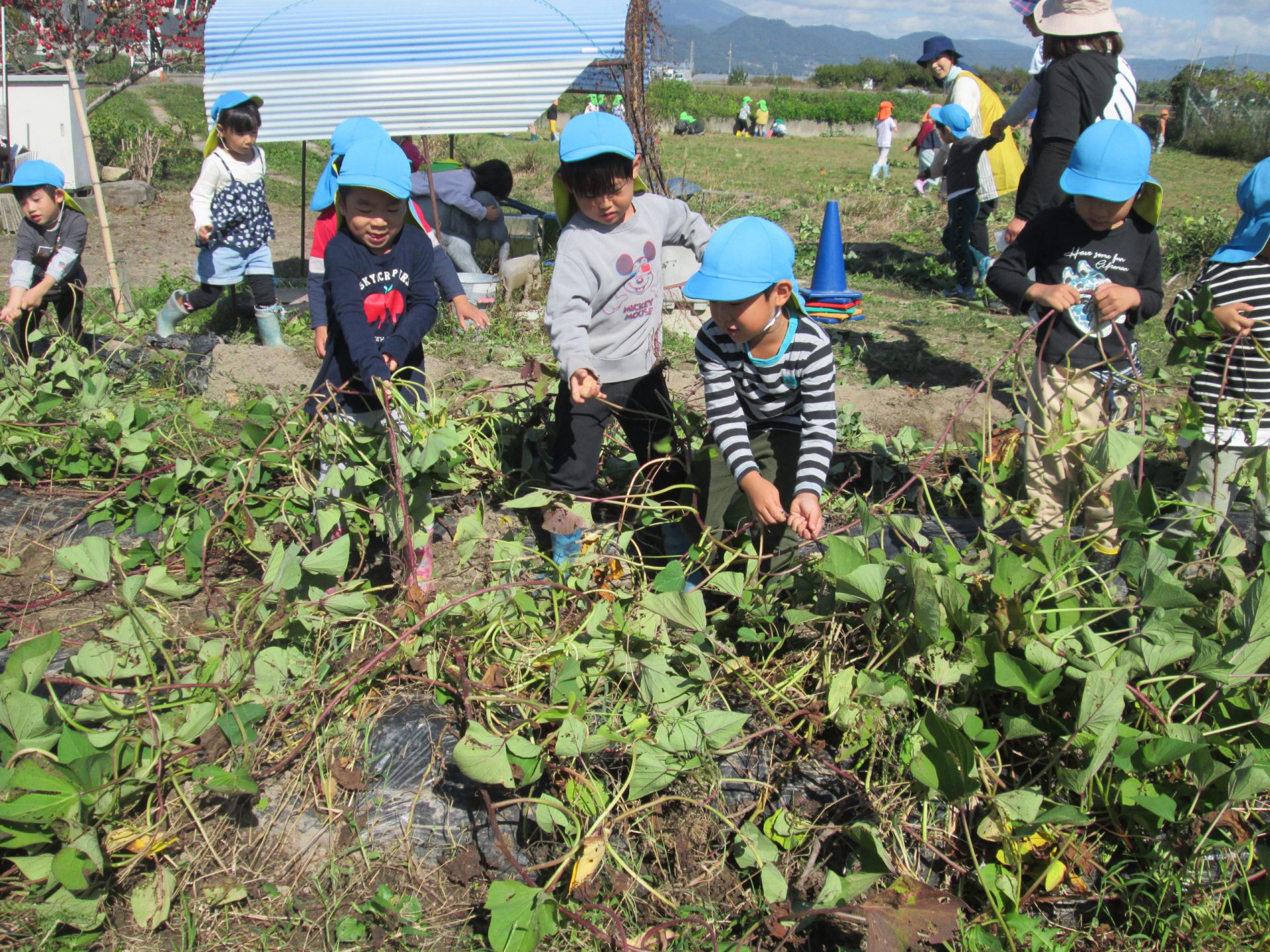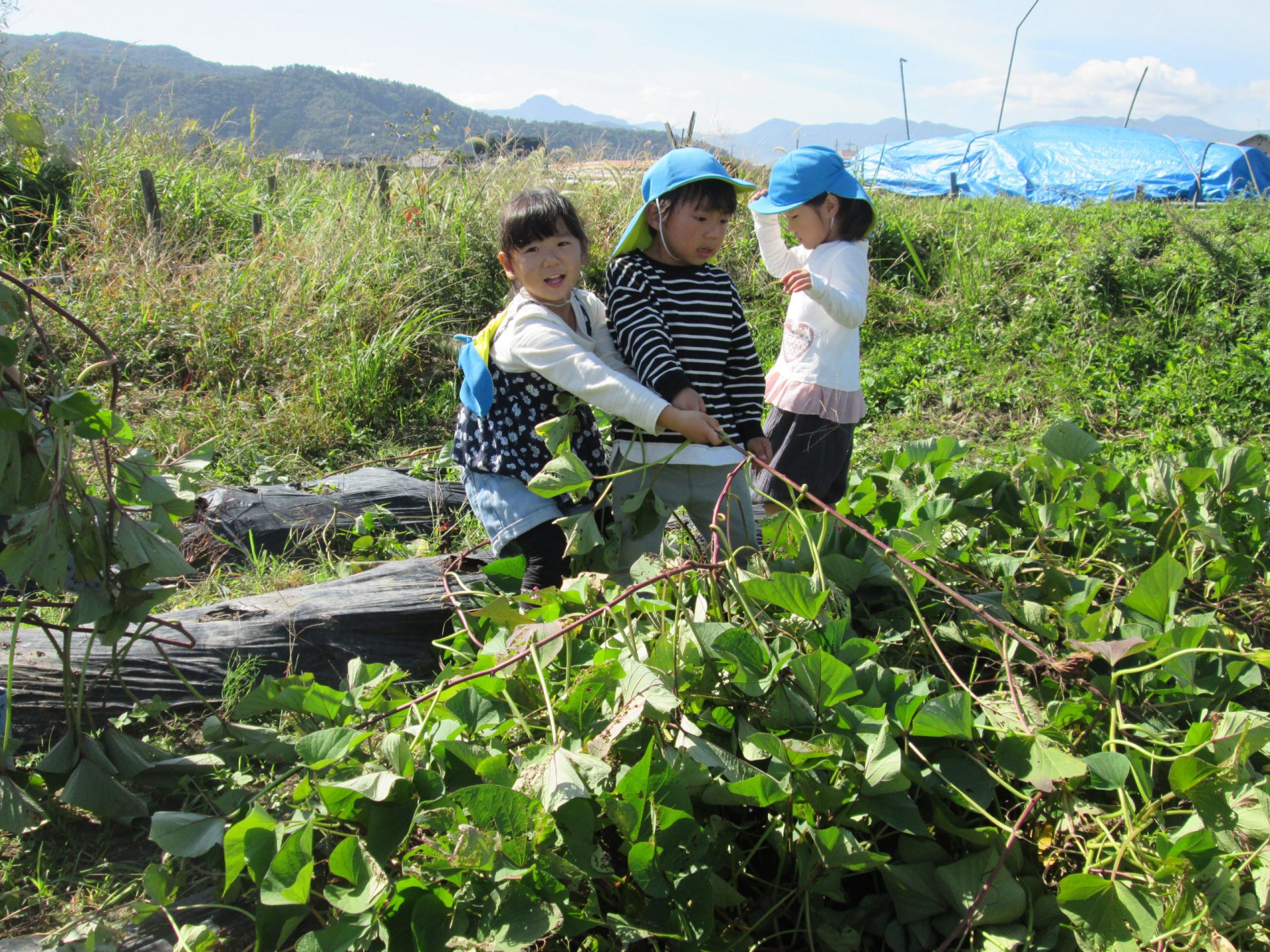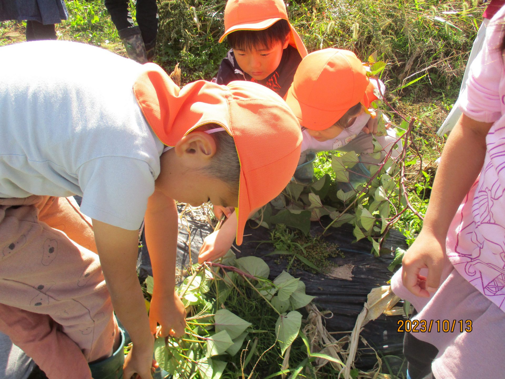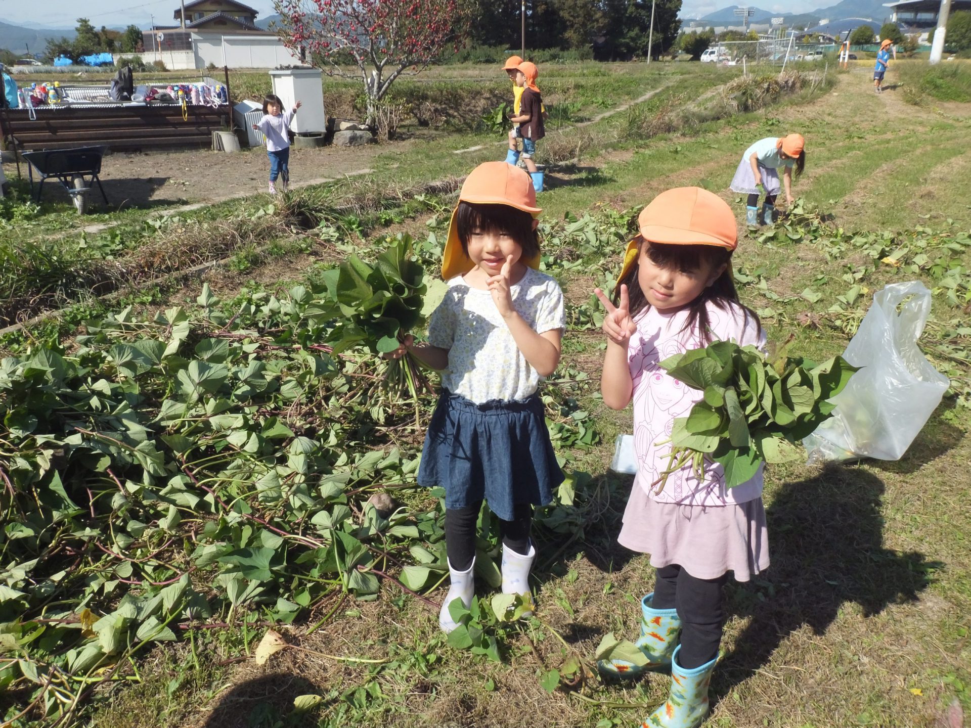 キラキラ太陽の下で、一生懸命さつまいものつる取りをしたり遊んだりして、汗ぐっしょりになるまで遊びました。