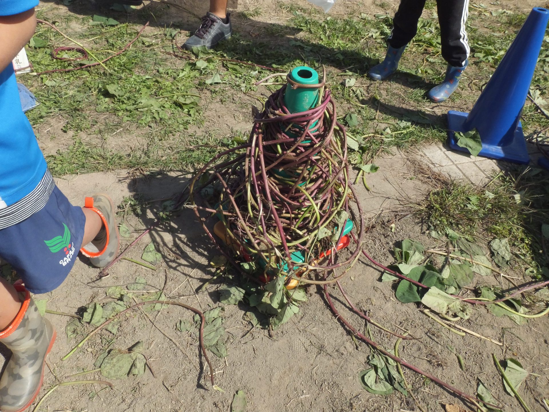 年中さんと年長さんは、おいものつるで、何かを作っていました。何になるのかな?
