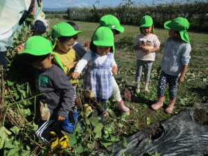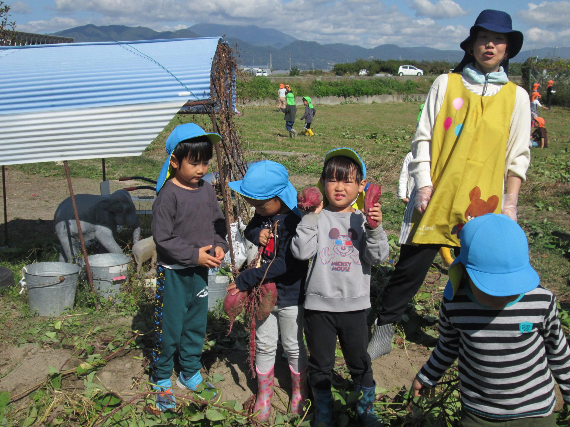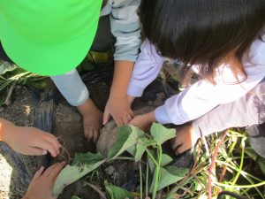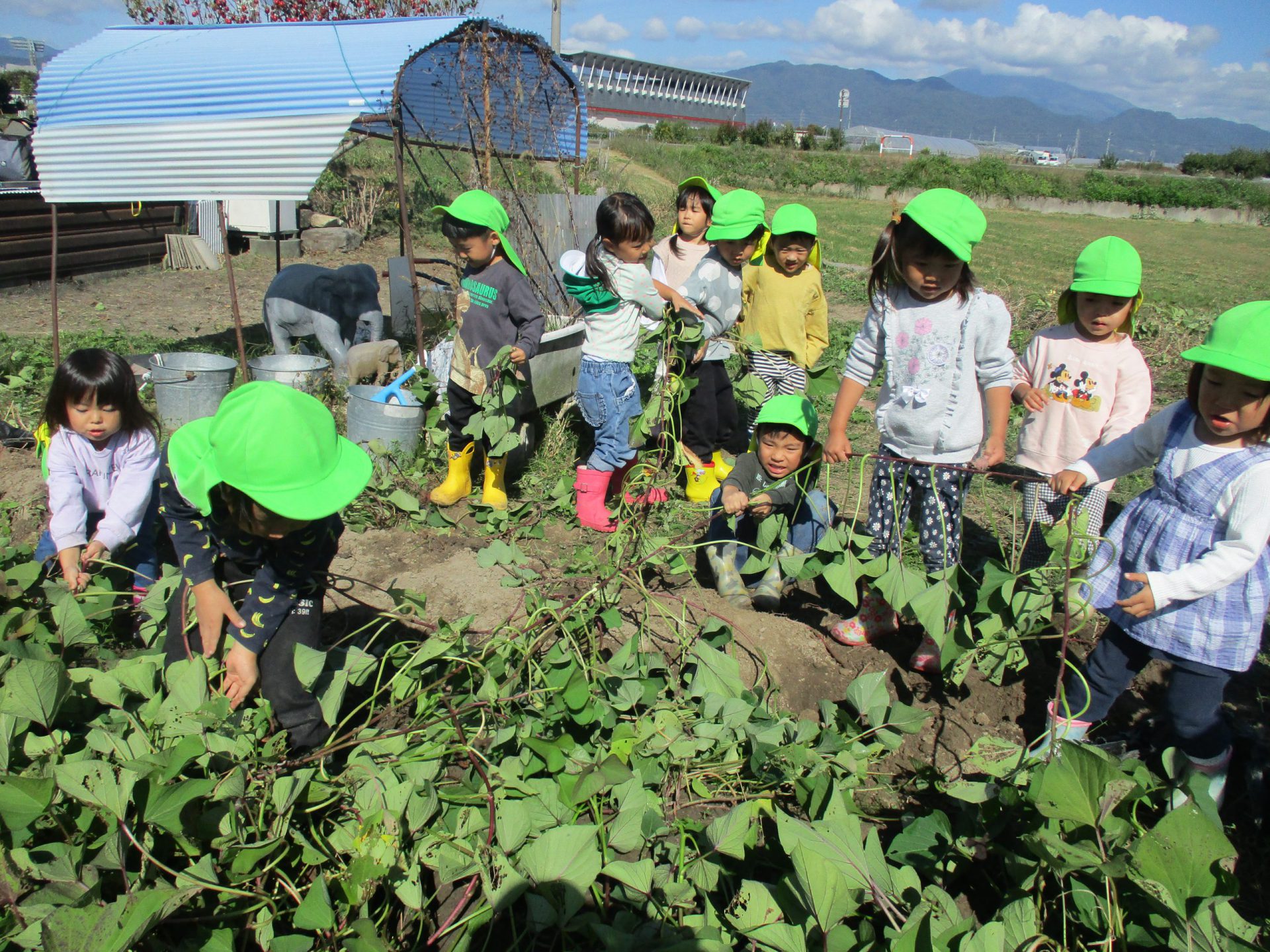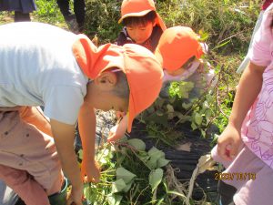 「おいも、大きくなっているかな?」初めての収獲にワクワクの年少さん。