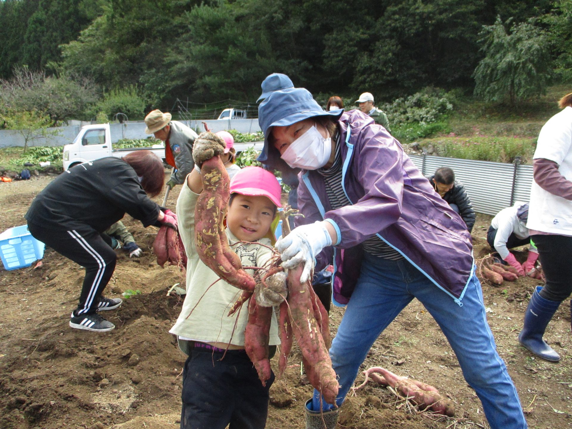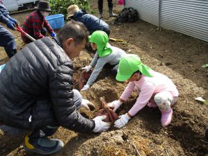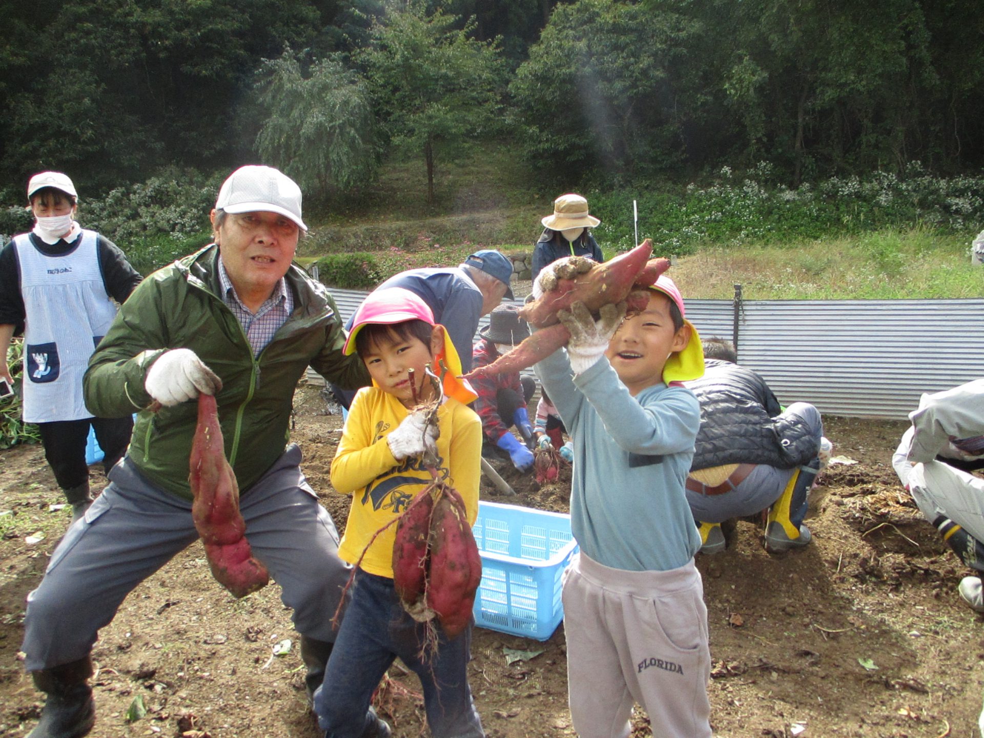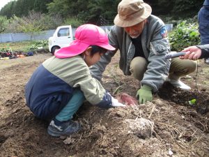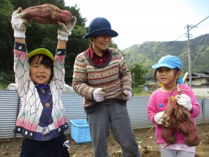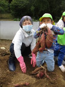 おじいちゃんおばあちゃんと一緒に、大きなお芋を掘っていきます。