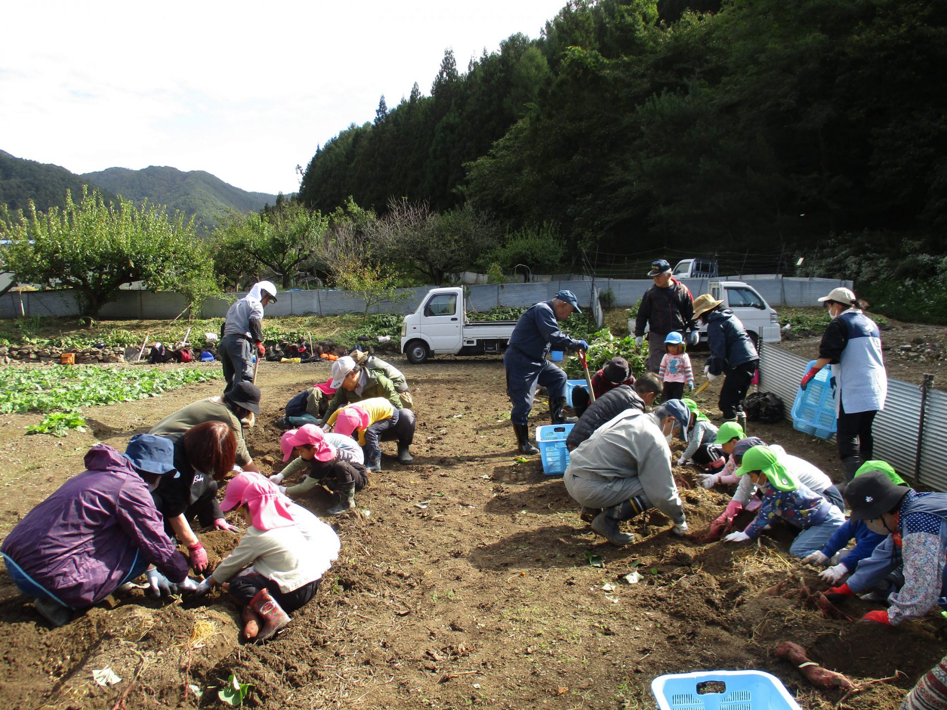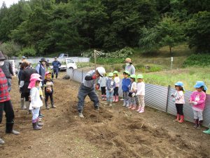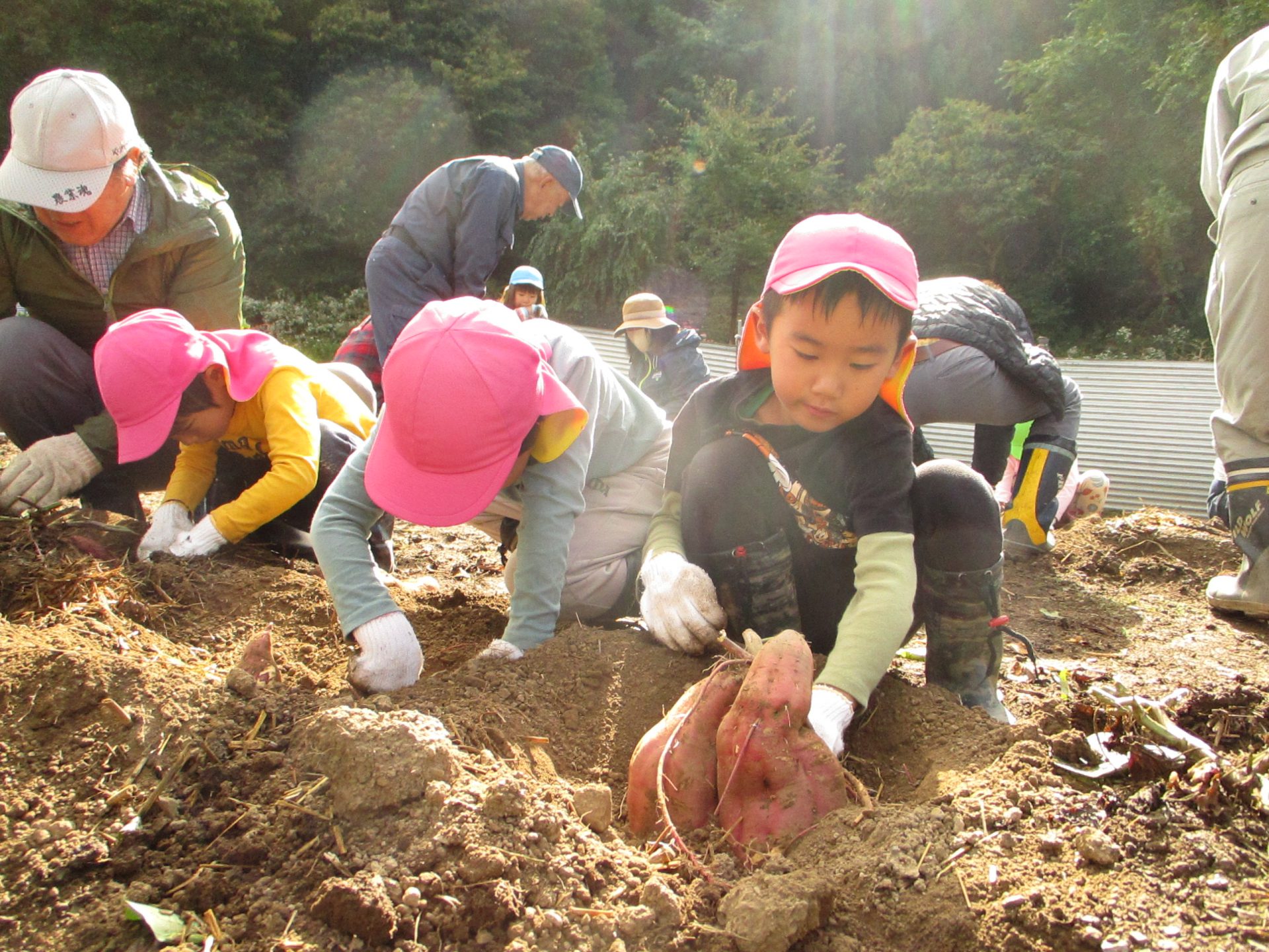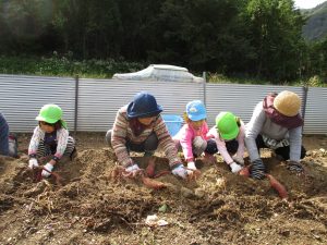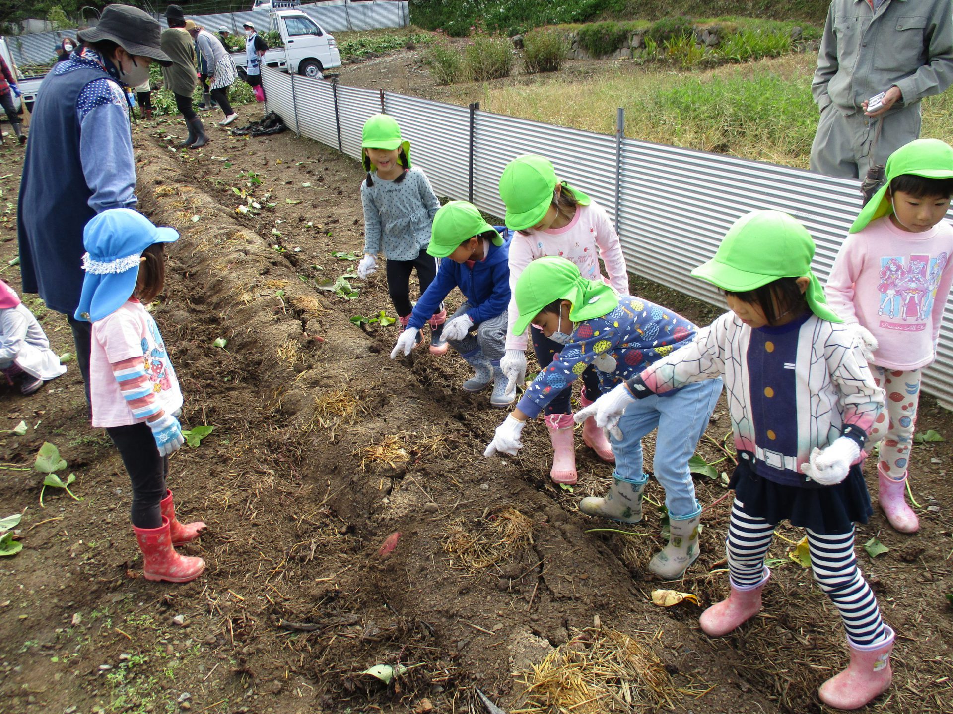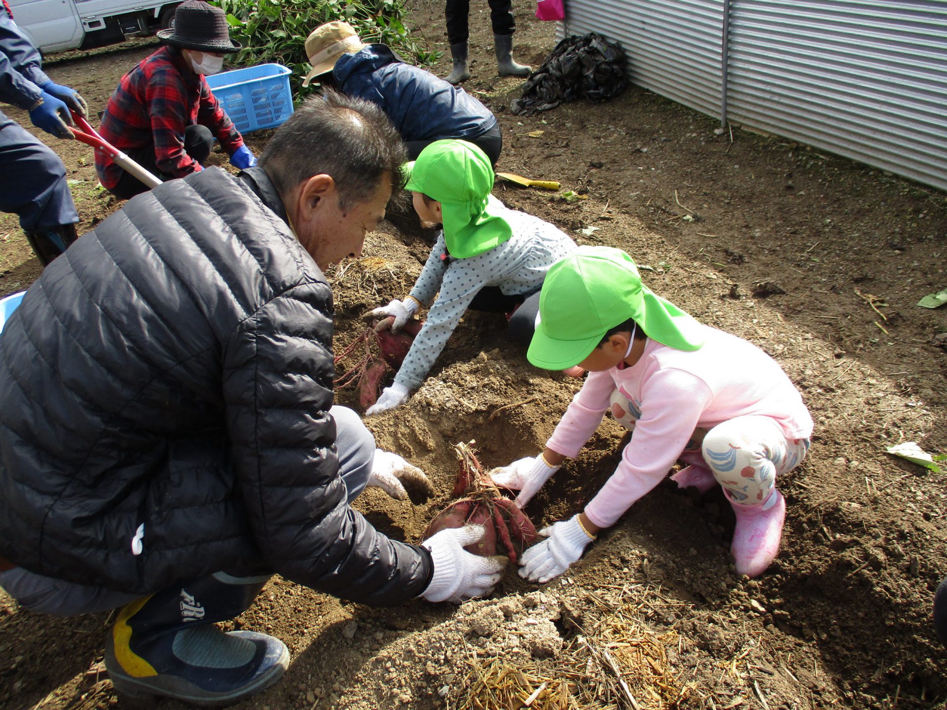 今年も地域の方に畑を貸していただき、サツマイモを育てる体験ができました。日々畑の様子を見に行きながら、サツマイモの収穫に期待を膨らませていた子ども達でしたが、当日は祖父母の皆さんの参加もあって、想像以上に嬉しそうな様子が見られました。子ども達と職員の力だけでは、この量の芋掘りは難しいところ。祖父母の皆さん、ボランティアの皆さん、様々な人の力があって、サツマイモの収穫ができたということへの感謝と喜びも感じることができました。