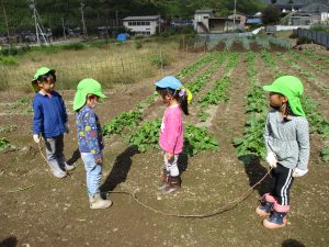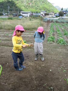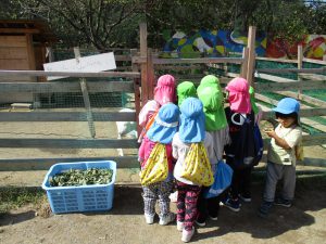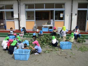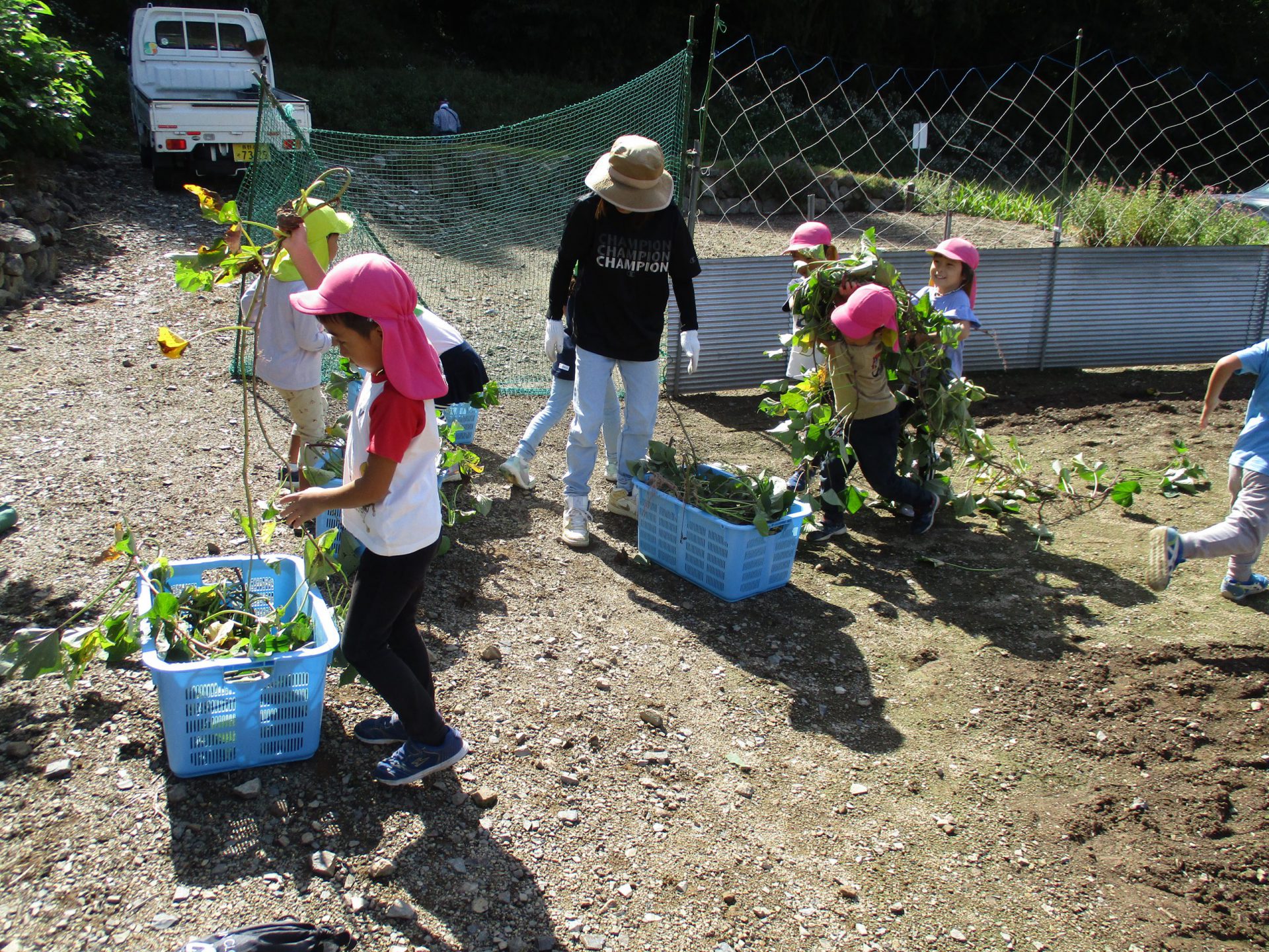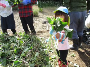 畑の恵みは、サツマイモだけではありませんでした。「茎も葉っぱも、人や動物の食べ物になる」「捨てるだけではもったいない」ということを、子ども達や保護者の方と共有することができました。子ども達の生き物に親しむ経験にもなりました。