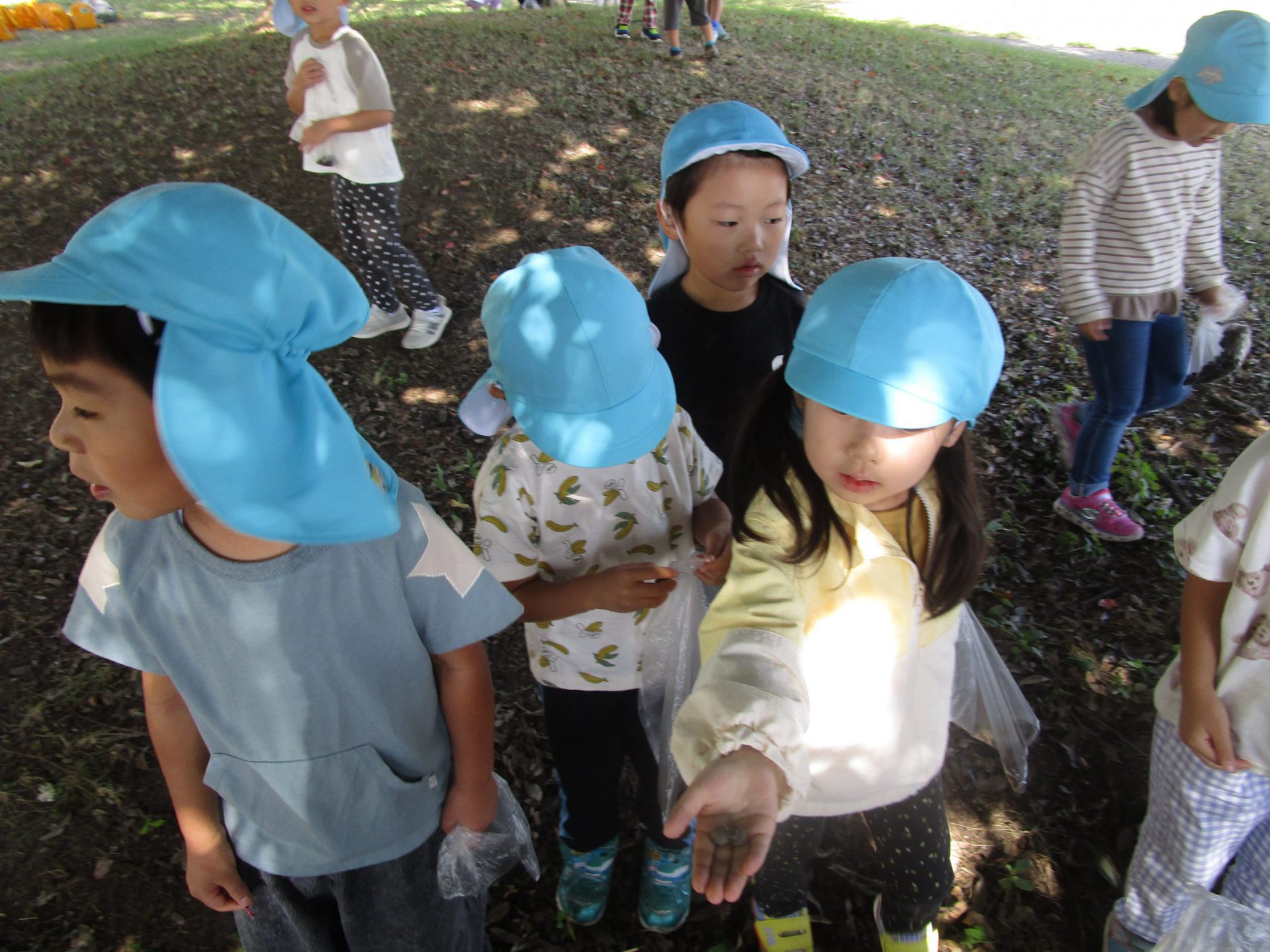 「こっちにたくさん落ちてるよ」「緑だ!緑のどんぐりだよ!」「見て!帽子かぶってるよ」と夢中になって拾う子ども達です。