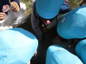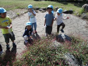 園庭とは少し違った発見ができた子ども達の姿を見て、改めて自然の中で遊ぶ事で、暑さや涼しさ、季節ごと違った虫に出会えること、木の葉の色や実に気付き、もっと発見を楽しみ、自然の不思議さや身近な自然に興味や関心を広げてほしいと思います。