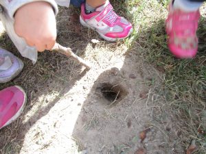「この穴はきっとモグラの穴だ!」「ヘビかも‼」「大きいからアリじゃないね…」「何かでつついたら何か出てくるかも…」と木の枝を探し、穴をつつき、何が出てくるか待ってみようとする姿も見られました。