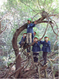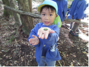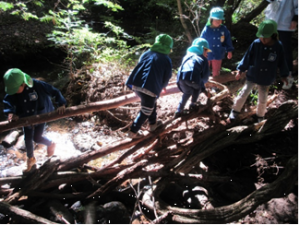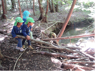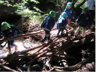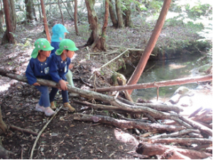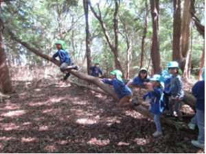 ・森の中の自然物を使って友だちと一緒に遊びを考えて遊ぶ。