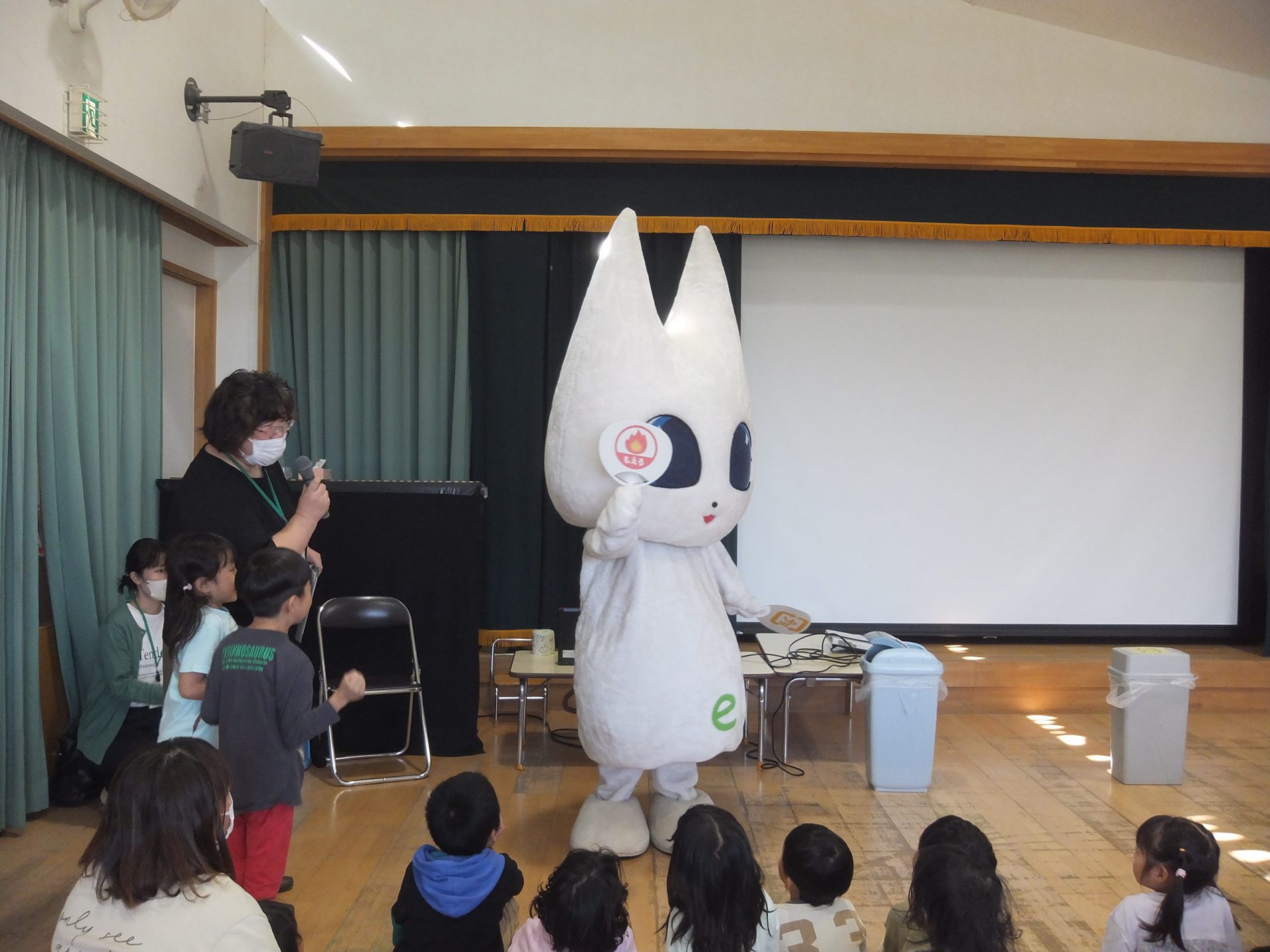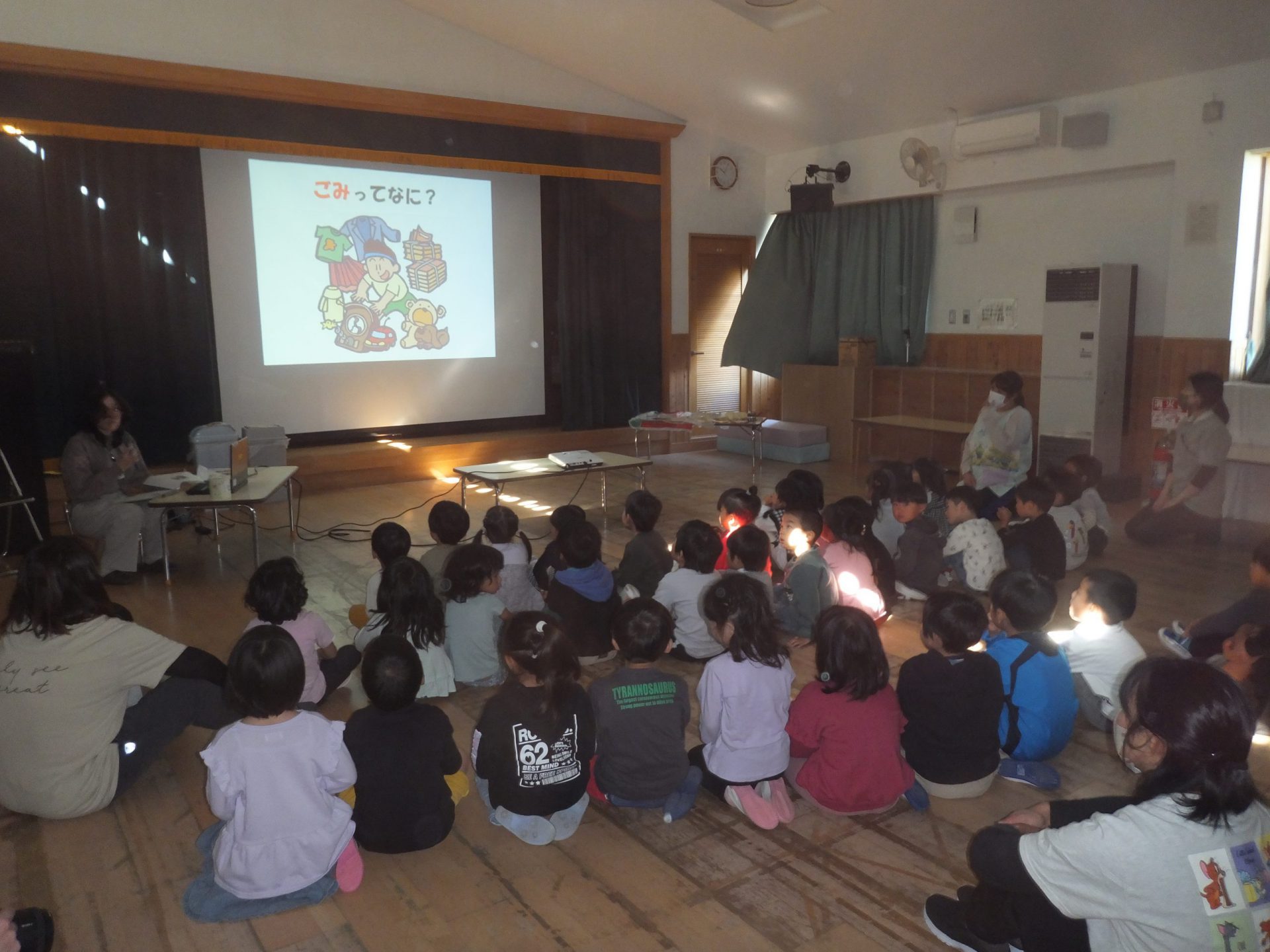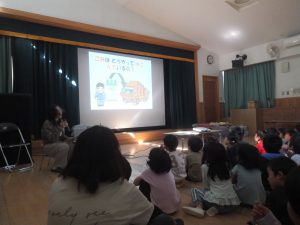 まずは、幼児組。電子紙芝居で「ごみのおはなし」を聞きます。