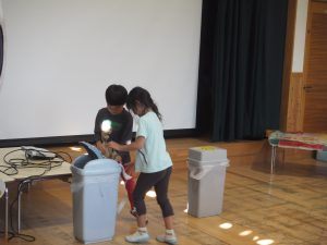 ・・・これは難しい。「袋にはプラごみって書いてあるけど・・・?」迷う子ども達。