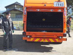 最初に、ごみ収集車にごみを投入するところです。