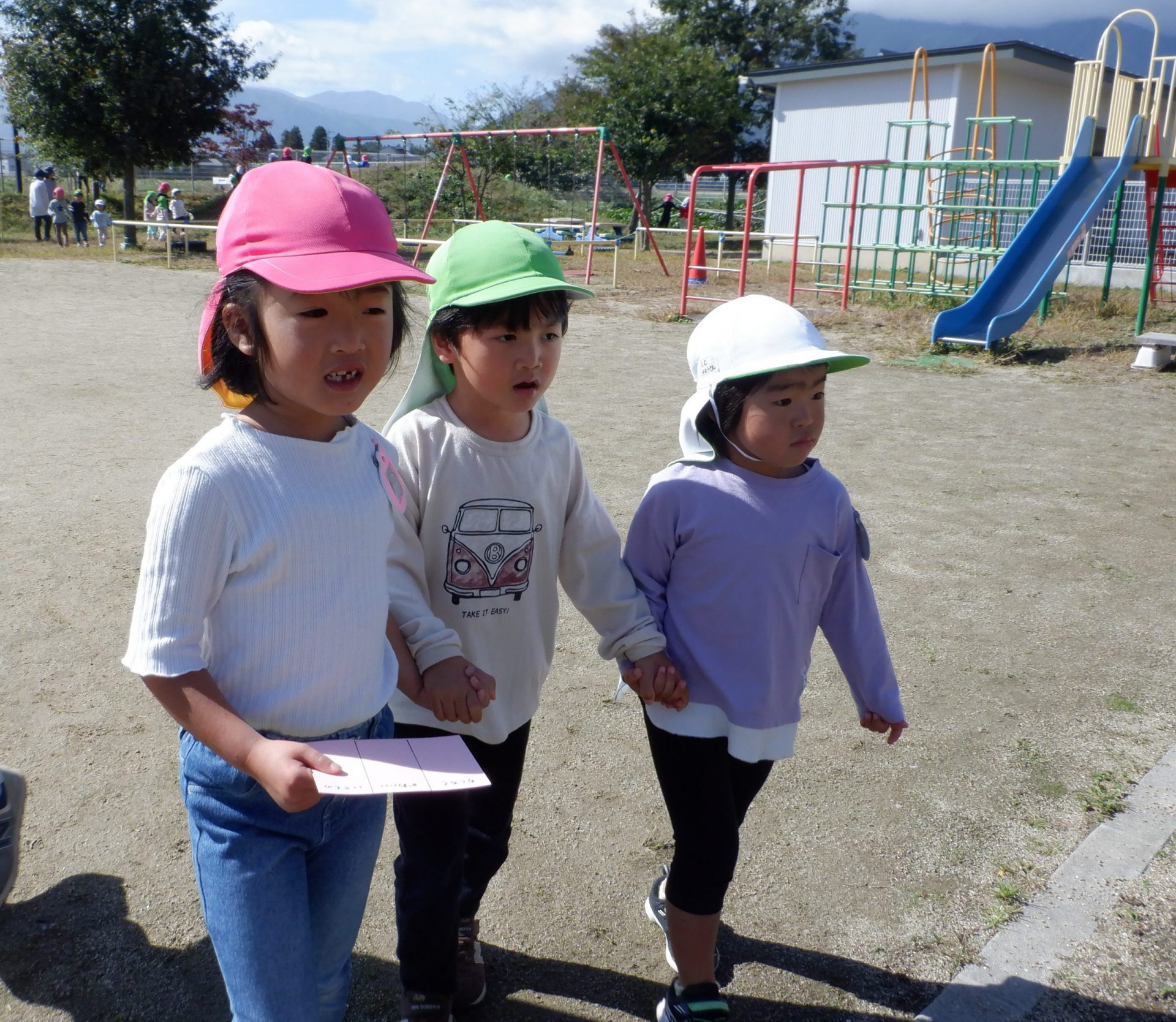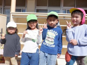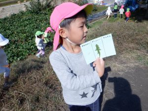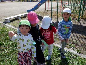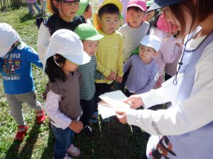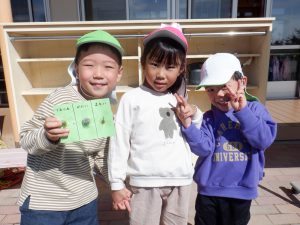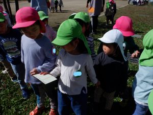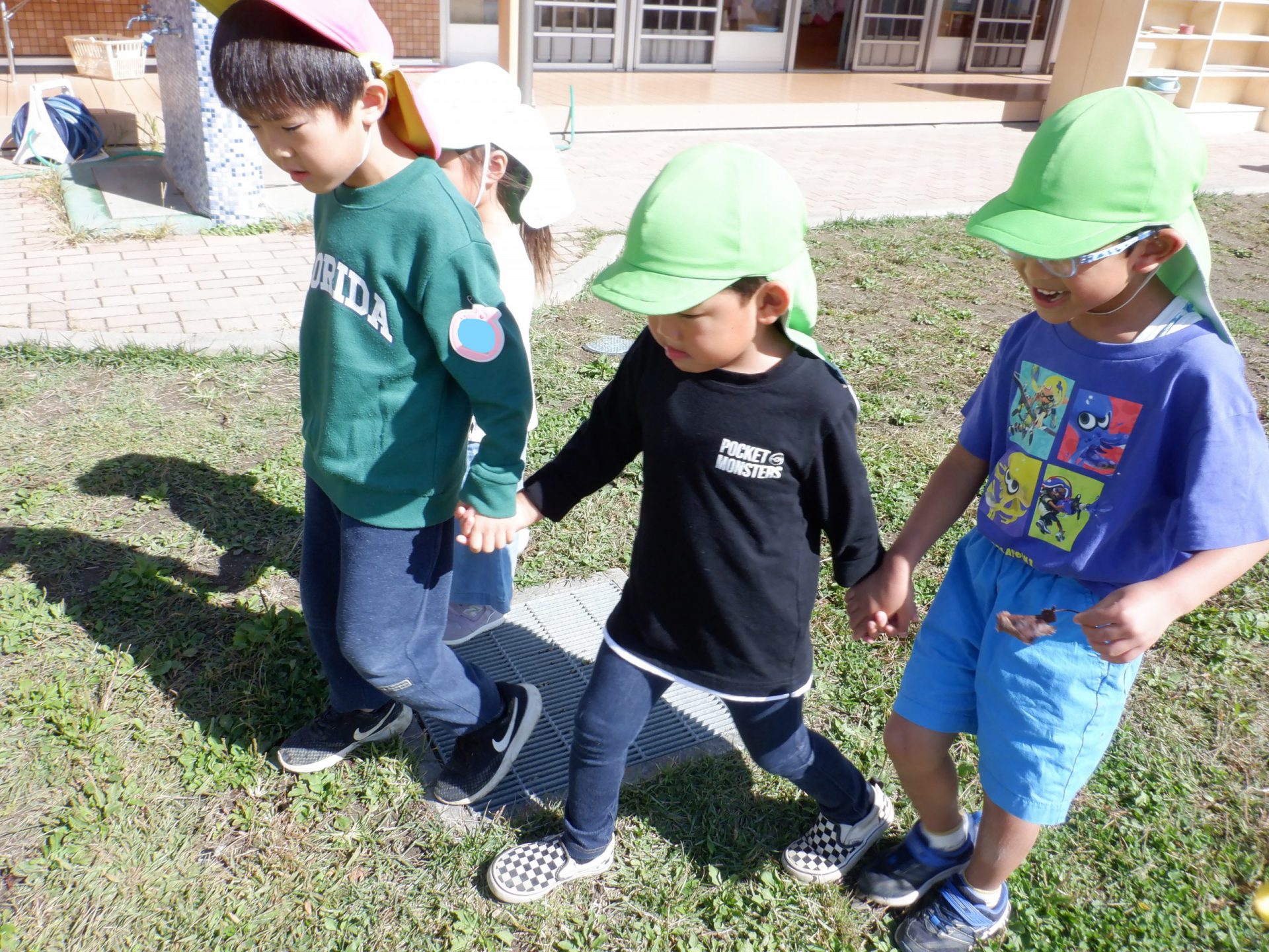 今月の誕生会のおたのしみは異年齢のペアでネイチャーゲーム!