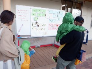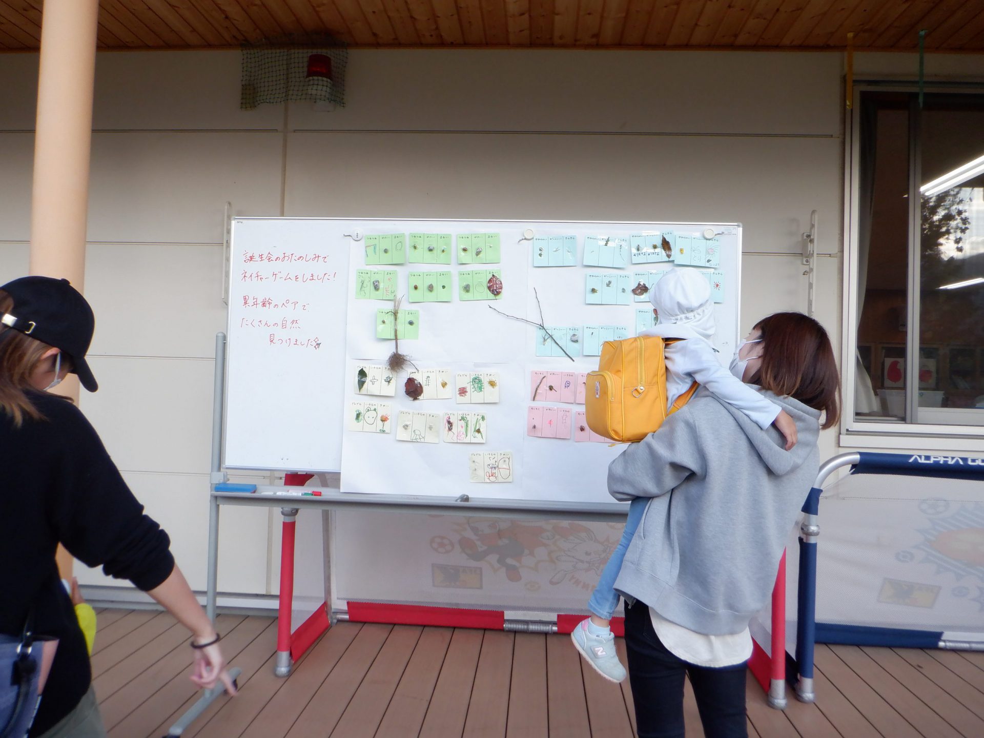 「これ私がみつけたんだよ〜!」降園時間には保護者の方にもみていただき、親子で会話する姿が見られました。