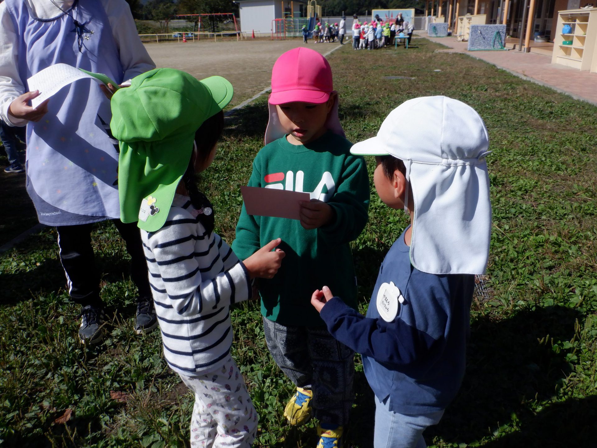 カードにある3つのお題のものを園庭からペアのお友達で協力して探します。