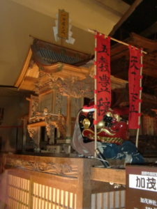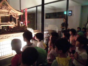 山車は神社と同じ意味なんだそうです。(左写真)そして、山車よりも小さい方は(右写真)神楽と言って、神様を楽しませる道具なんですって。まさに文字通り。これには、大人たちが納得。