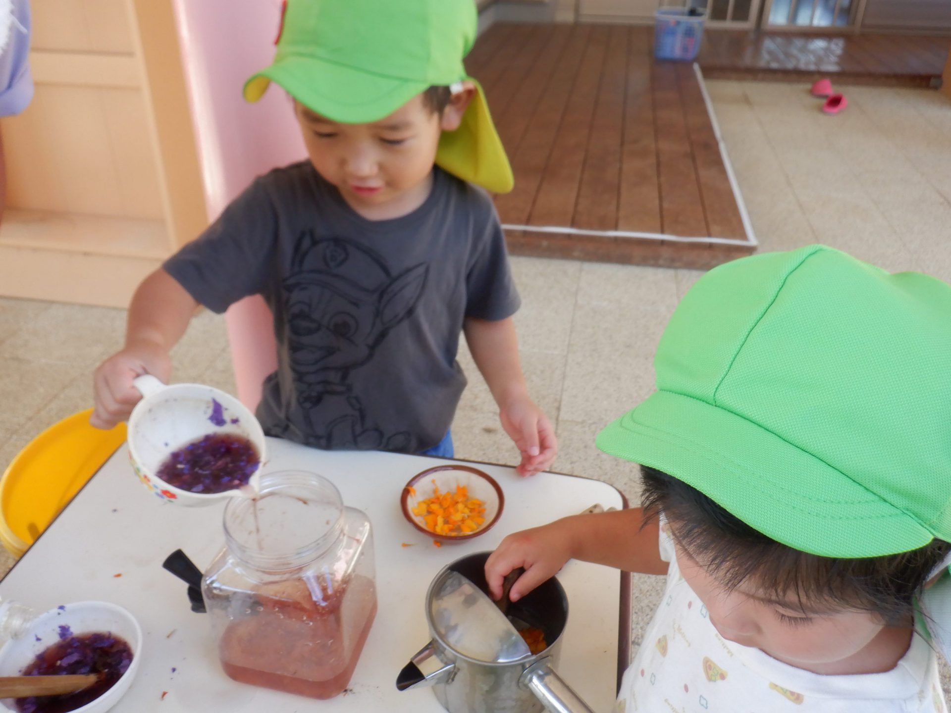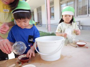 はじめは保育士が用意していた色水遊びの用具も、今では子どもが進んで用意するようになって来ました。