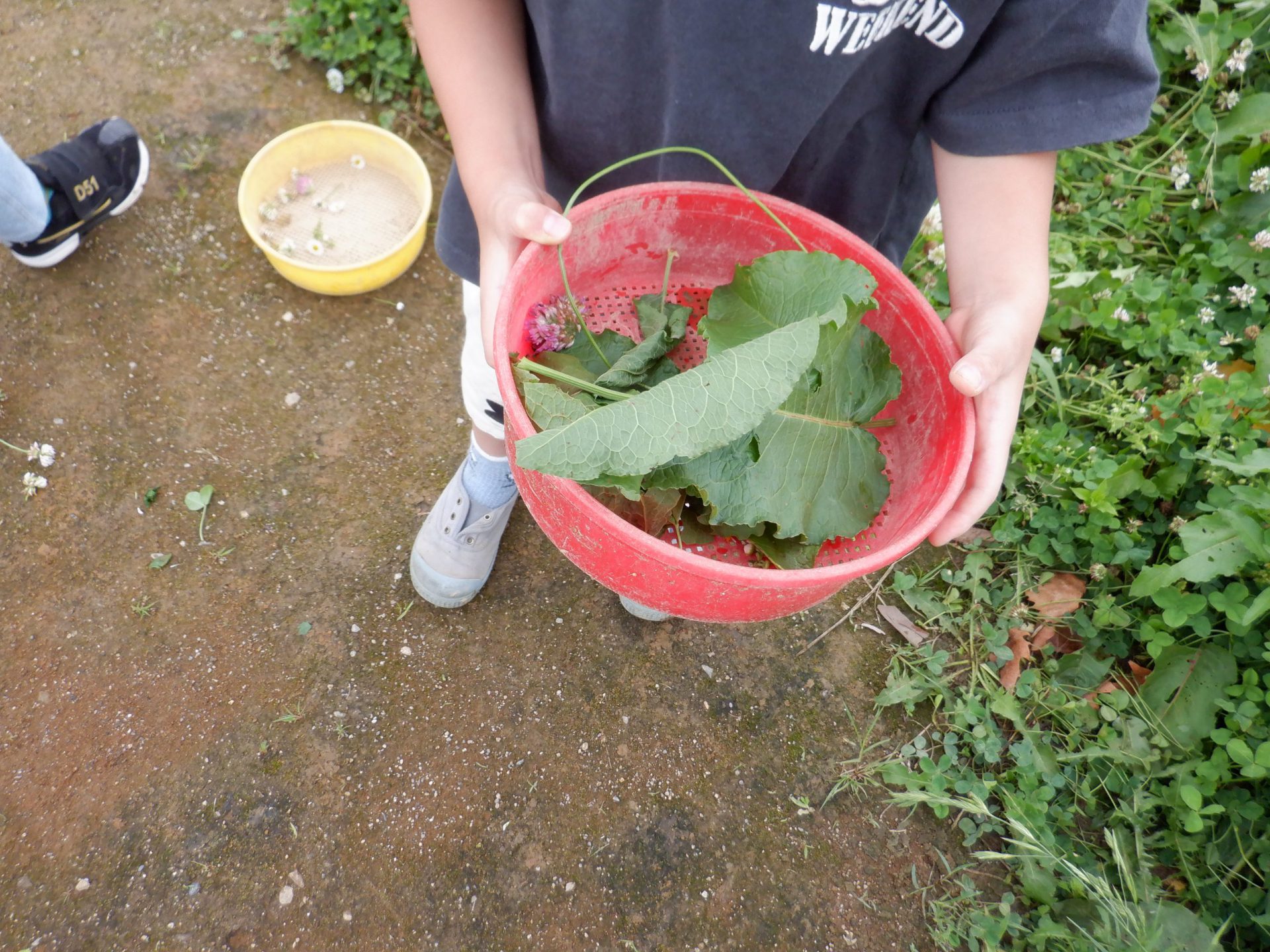 色水に使う葉っぱ花を見つけに行きます。