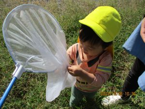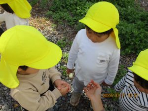 初めて見る虫や自然のものなど、自分で見つけてみんなに見せるといったその繰り返しがとても楽しそうです。
